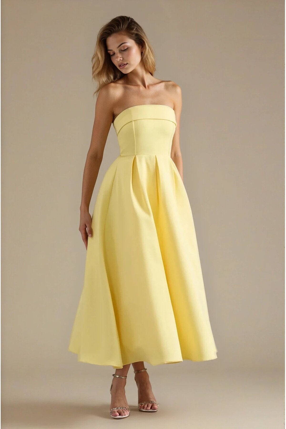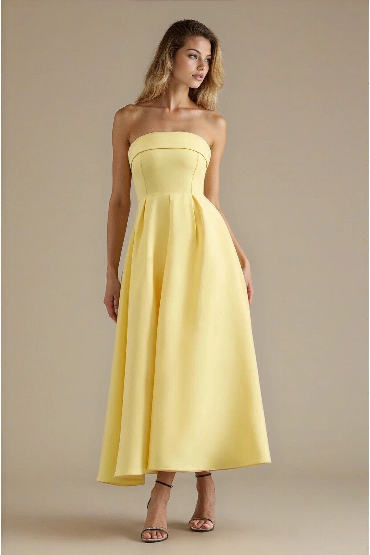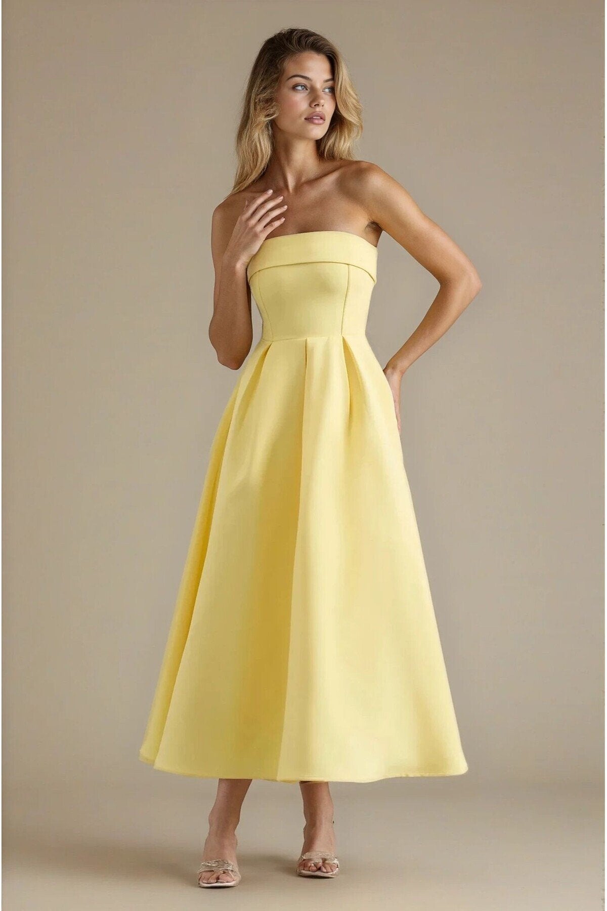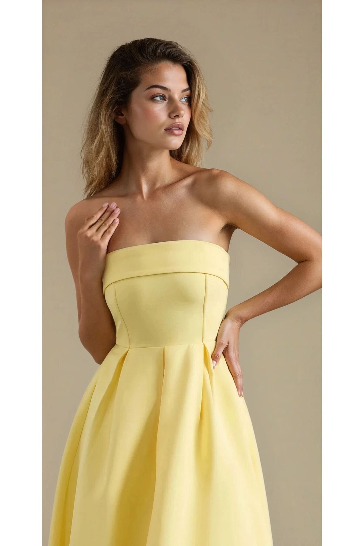 - Straplez yaka tasarımı ile feminen bir görünüm sunar ve dekolte bölgesini zarifçe sergiler.; - Orta kalınlıkta polyester kumaşı, rahat bir kullanım sağlarken dayanıklılığı artırır.; - Düğün, nişan ve davet gibi özel günlerinizde şıklığınızı tamamlayacak kloş kesim tasarımıyla dikkat çeker.; - Baskısız düz dokuma kumaşı sayesinde sade ve şık bir görünüm elde edilir.; - Cepsiz tasarımı ile minimalist estetiği ön plana çıkarırken, kemersiz yapısı kolay giyilip çıkarılmasını sağlar.; - Astarsız yapısıyla hafif ve konforlu bir deneyim sunarken, kapsız olması yaz aylarında serinlik sağlar.; - Fermuarlı kapama şekli pratik kullanım imkanı tanırken, gipeli detaylar elbiseye hareket kazandırır.; - Düz desenli ve A kesim siluetiyle her vücut tipine uyum sağlayarak zarif bir duruş sergiler.; - Tekli paket içeriğiyle kolayca saklanabilir ve taşınabilir.; - Türkiye menşeli ürün, yerel üretim desteklenerek sürdürülebilirliğe katkıda bulunur.; - Uzun boyu ile zarif ve asil bir görünüm sunarken, yetişkin yaş grubuna hitap eder.;