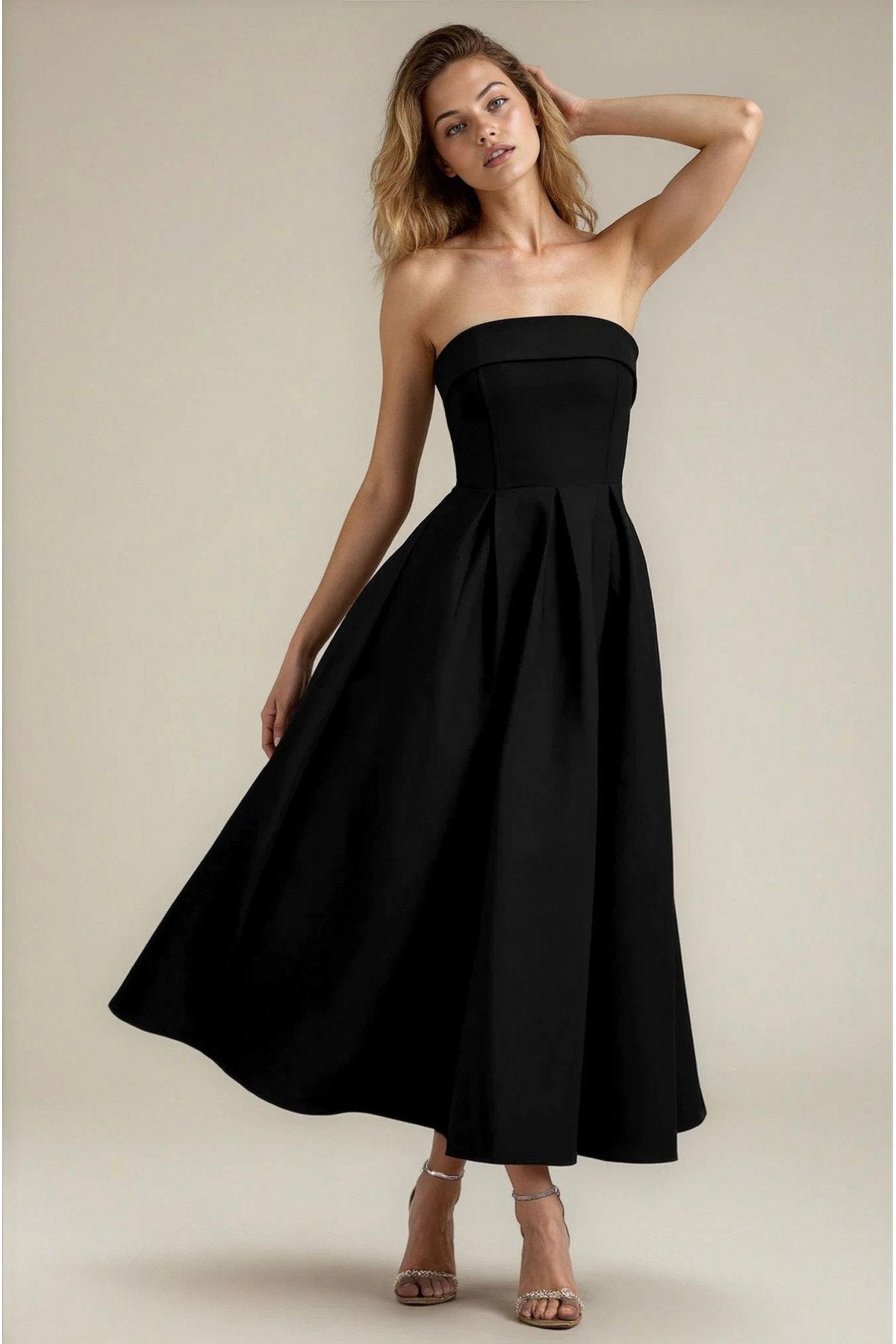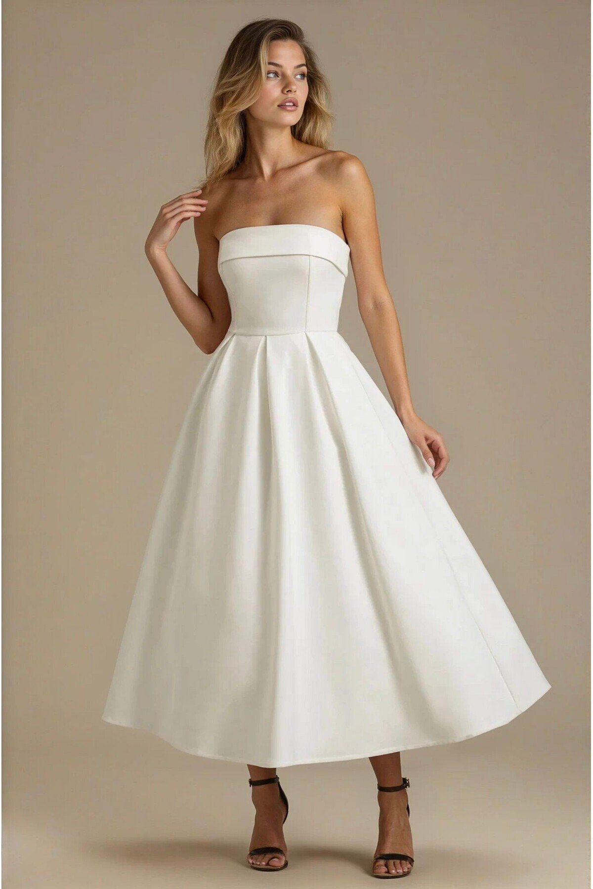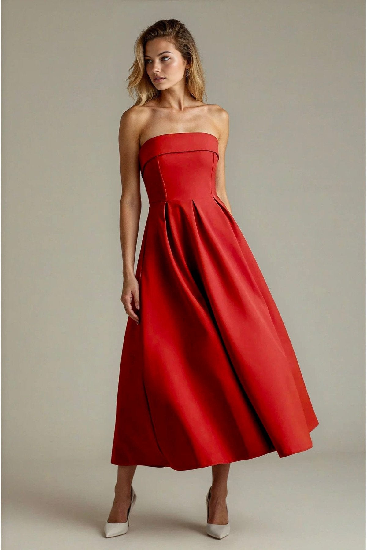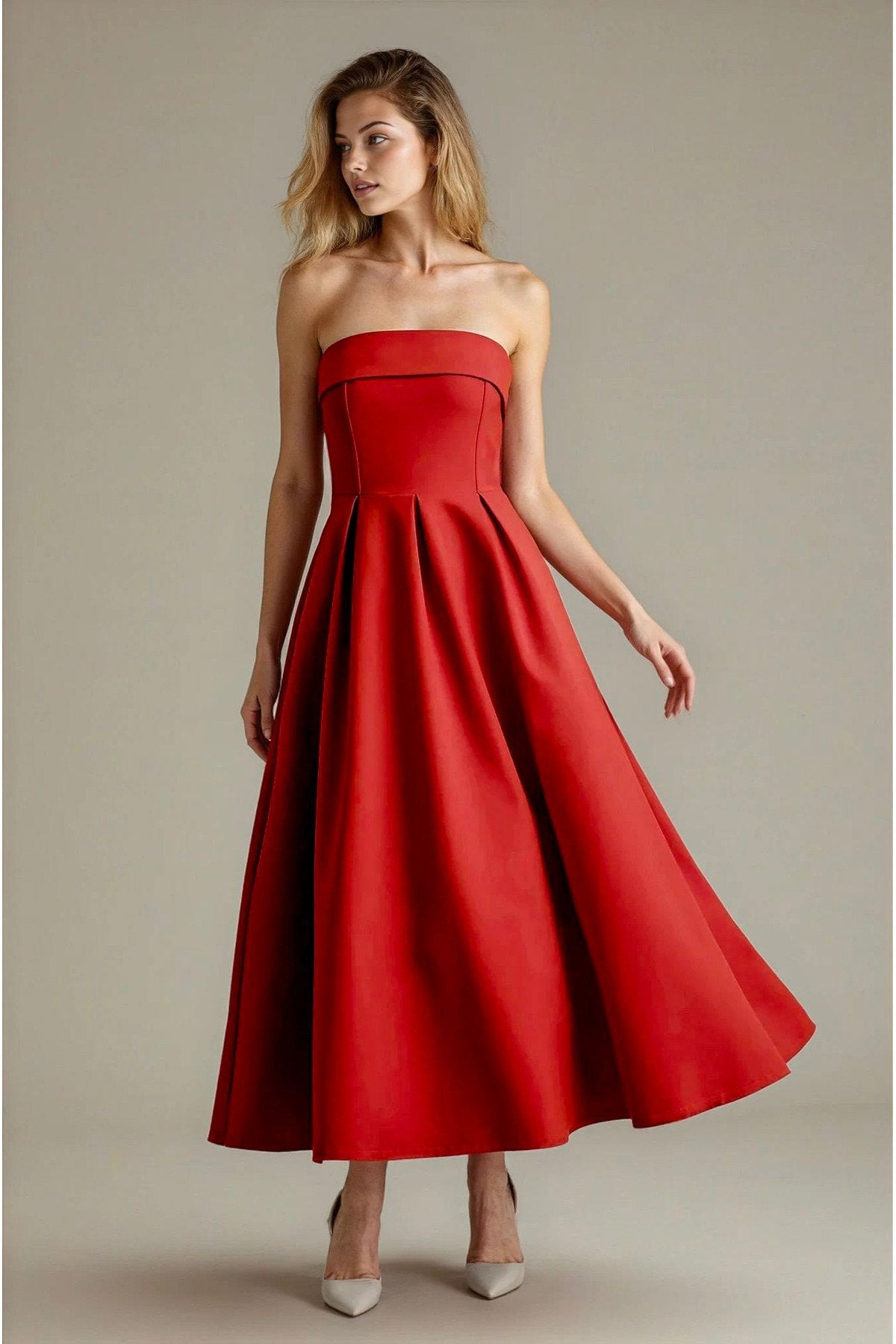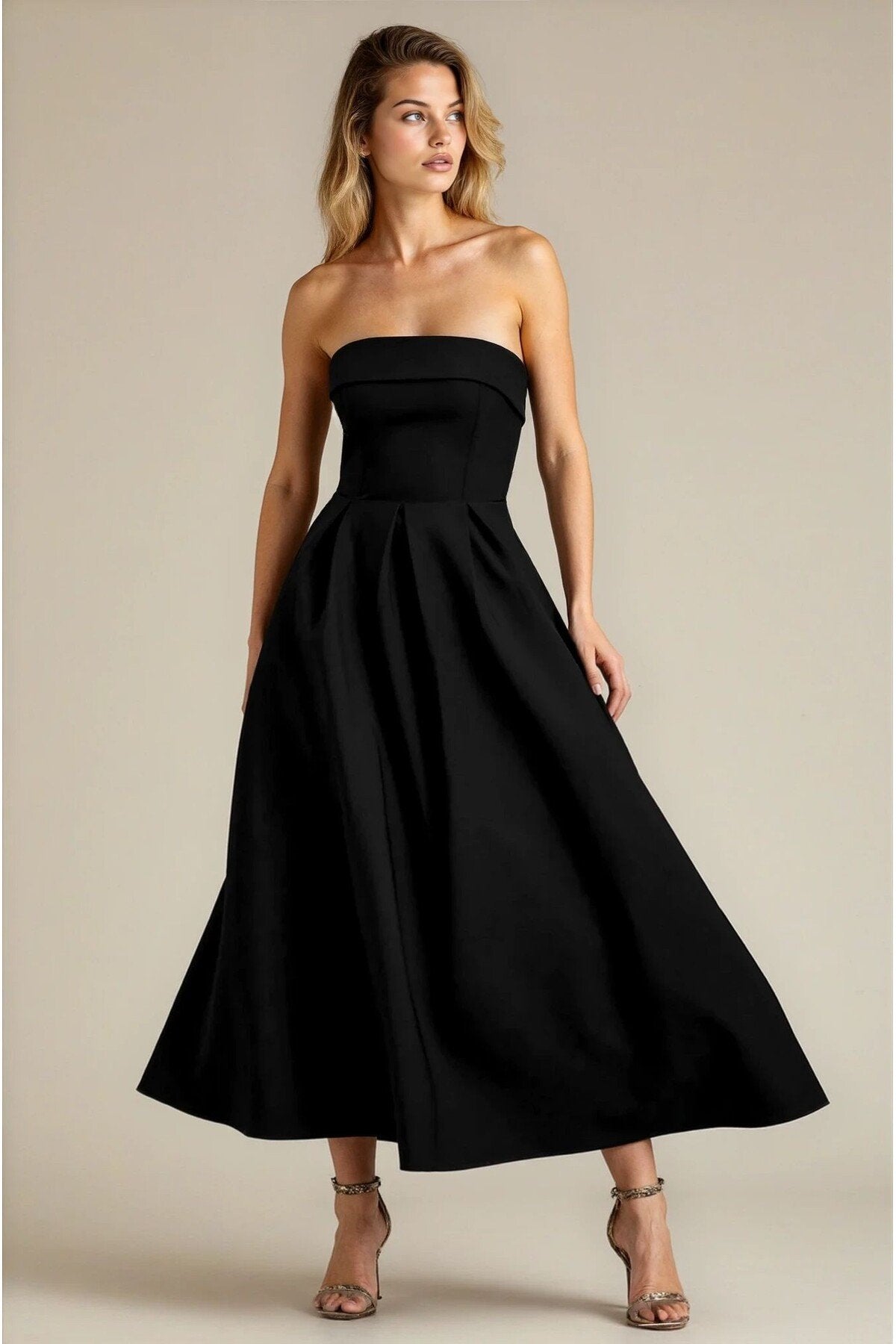 - Straplez yaka tasarımı ile feminen bir görünüm sunar ve dekolte bölgesini zarifçe sergiler.; - Orta kalınlıkta polyester kumaşı, rahat bir kullanım sağlarken dayanıklılığı artırır.; - Düğün, nişan ve davet gibi özel günlerinizde şıklığınızı tamamlayacak kloş kesim tasarımıyla dikkat çeker.; - Baskısız düz dokuma kumaşı sayesinde sade ve şık bir görünüm elde edilir.; - Cepsiz tasarımı ile minimalist estetiği ön plana çıkarırken, kemersiz yapısı kolay giyilip çıkarılmasını sağlar.; - Astarsız yapısıyla hafif ve konforlu bir deneyim sunarken, kapsız olması yaz aylarında serinlik sağlar.; - Fermuarlı kapama şekli pratik kullanım imkanı tanırken, gipeli detaylar elbiseye hareket kazandırır.; - Düz desenli ve A kesim siluetiyle her vücut tipine uyum sağlayarak zarif bir duruş sergiler.; - Tekli paket içeriğiyle kolayca saklanabilir ve taşınabilir.; - Türkiye menşeli ürün, yerel üretim desteklenerek sürdürülebilirliğe katkıda bulunur.; - Uzun boyu ile zarif ve asil bir görünüm sunarken, yetişkin yaş grubuna hitap eder.;