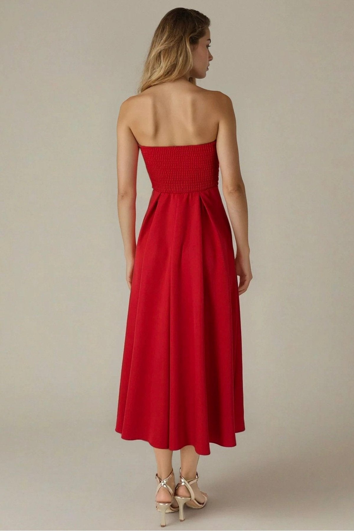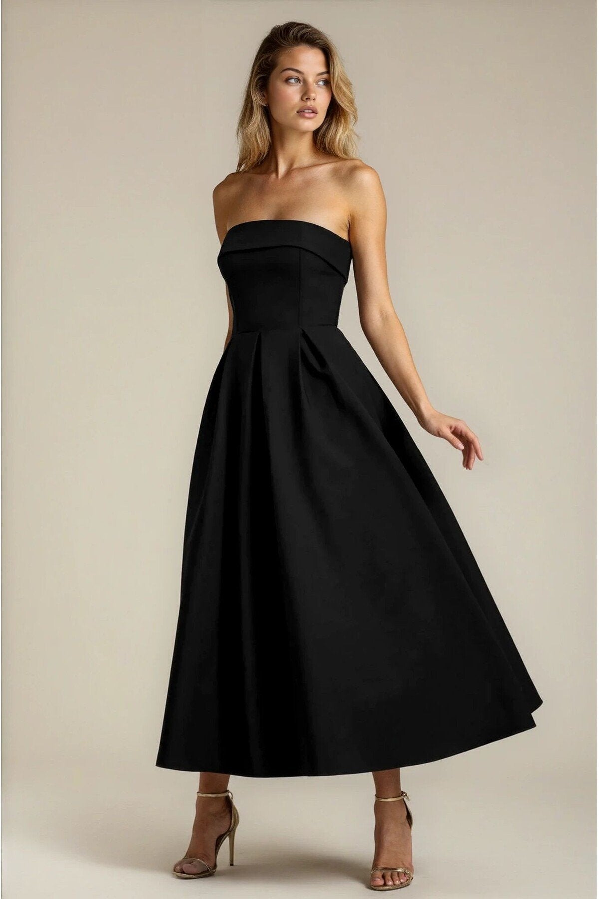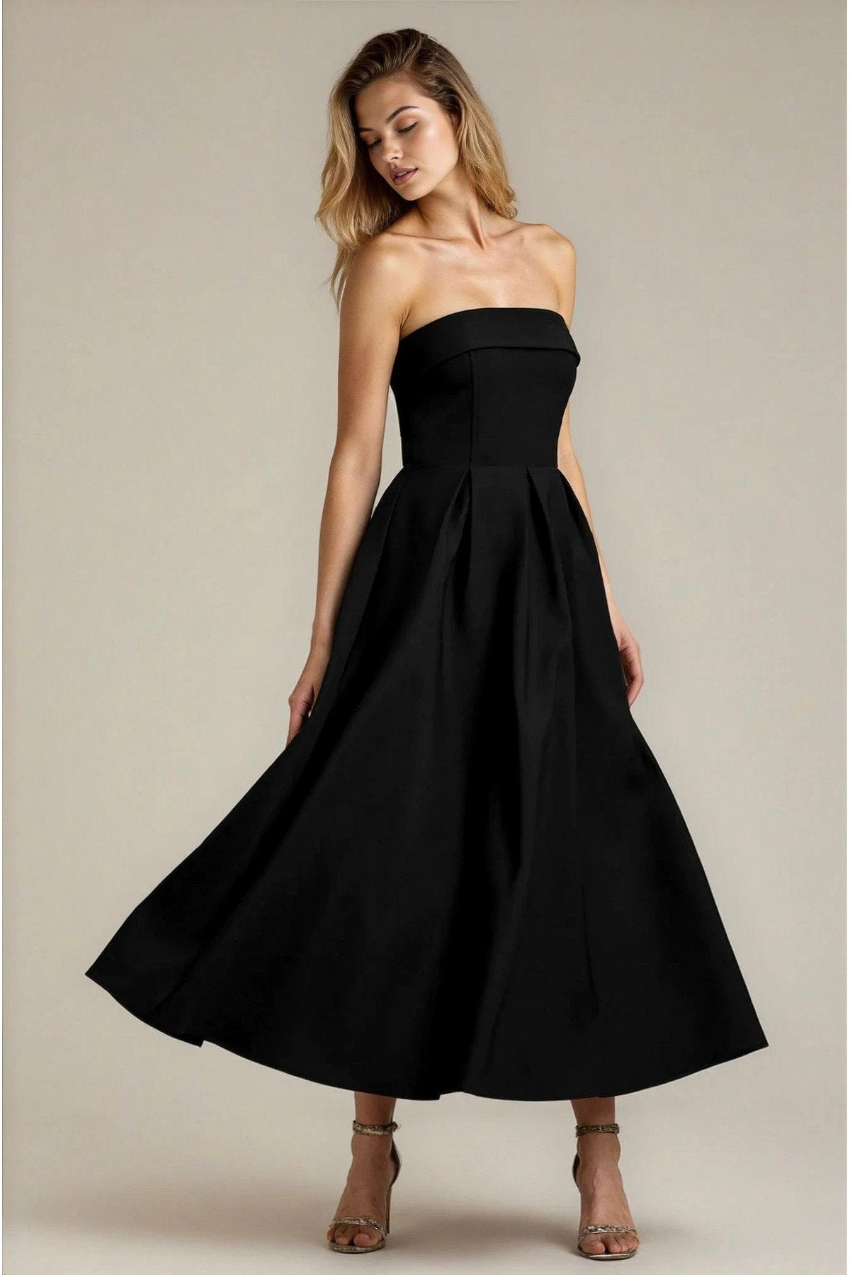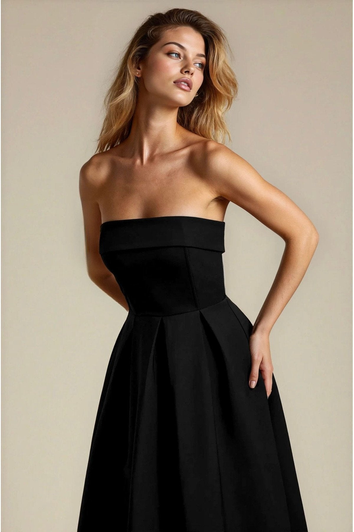 - Straplez yaka tasarımı ile feminen bir görünüm sunar ve dekolte bölgesini zarifçe sergiler.; - Orta kalınlıkta polyester kumaşı, rahat bir kullanım sağlarken dayanıklılığı artırır.; - Düğün, nişan ve davet gibi özel günlerinizde şıklığınızı tamamlayacak kloş kesim tasarımıyla dikkat çeker.; - Baskısız düz dokuma kumaşı sayesinde sade ve şık bir görünüm elde edilir.; - Cepsiz tasarımı ile minimalist estetiği ön plana çıkarırken, kemersiz yapısı kolay giyilip çıkarılmasını sağlar.; - Astarsız yapısıyla hafif ve konforlu bir deneyim sunarken, kapsız olması yaz aylarında serinlik sağlar.; - Fermuarlı kapama şekli pratik kullanım imkanı tanırken, gipeli detaylar elbiseye hareket kazandırır.; - Düz desenli ve A kesim siluetiyle her vücut tipine uyum sağlayarak zarif bir duruş sergiler.; - Tekli paket içeriğiyle kolayca saklanabilir ve taşınabilir.; - Türkiye menşeli ürün, yerel üretim desteklenerek sürdürülebilirliğe katkıda bulunur.; - Uzun boyu ile zarif ve asil bir görünüm sunarken, yetişkin yaş grubuna hitap eder.;