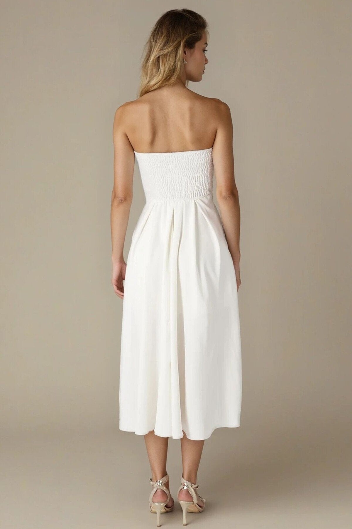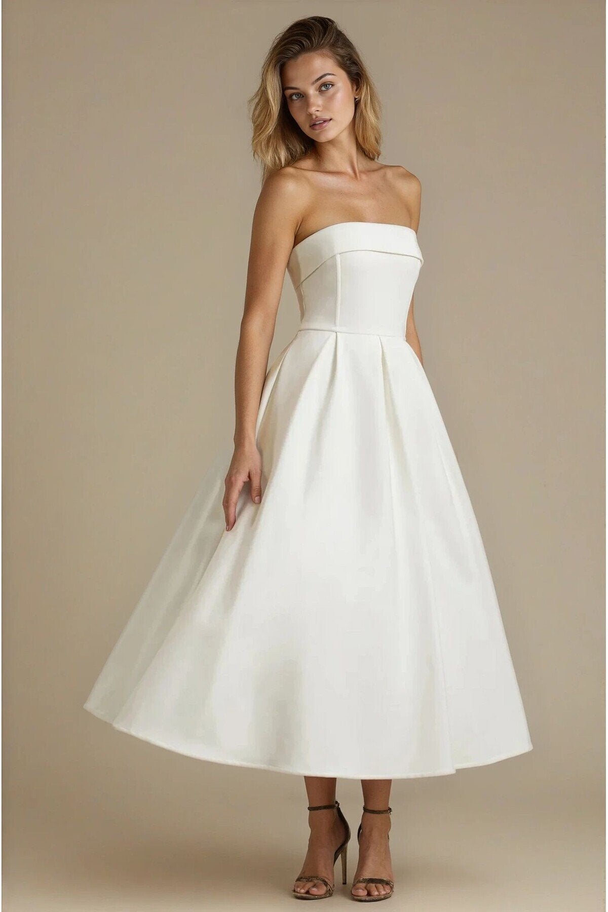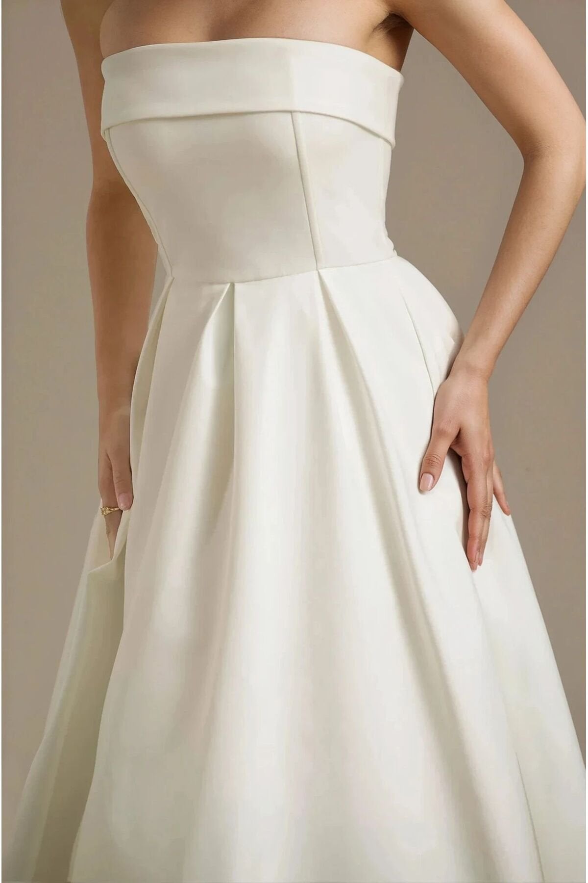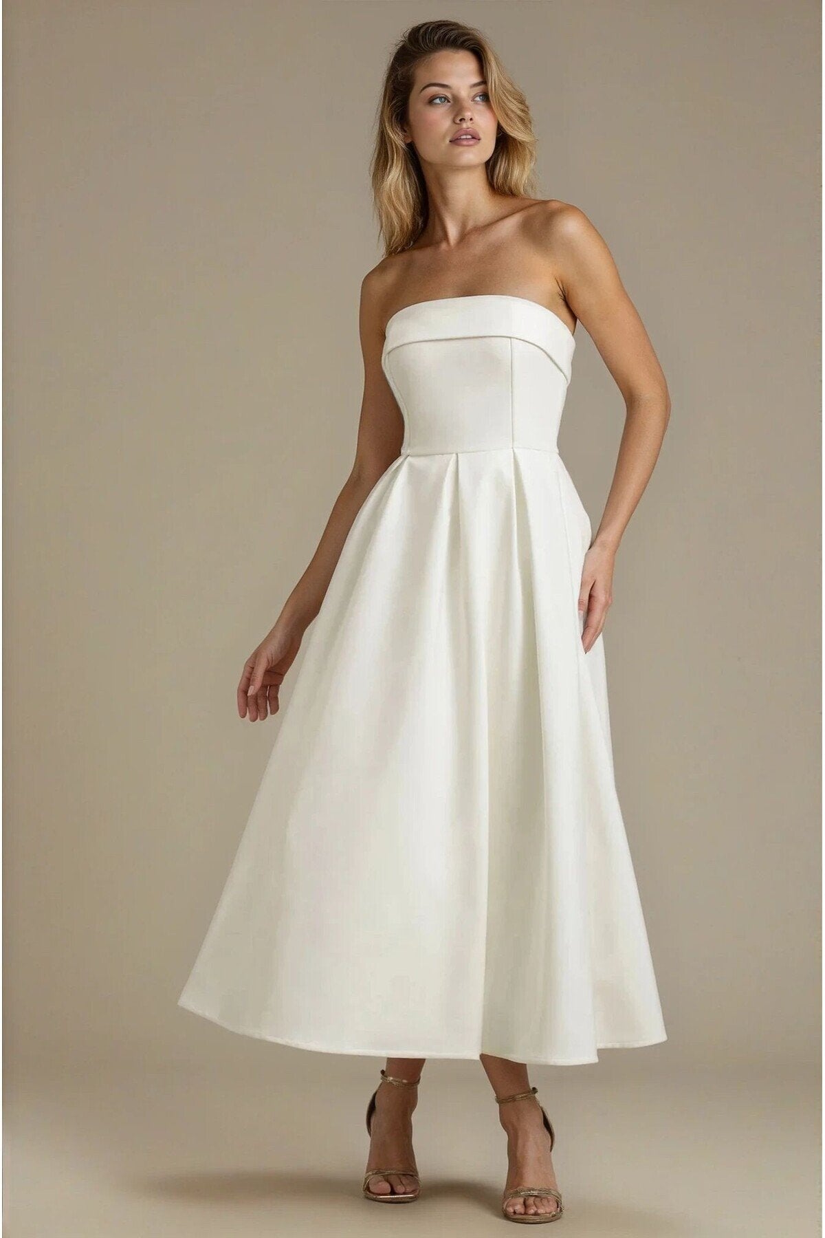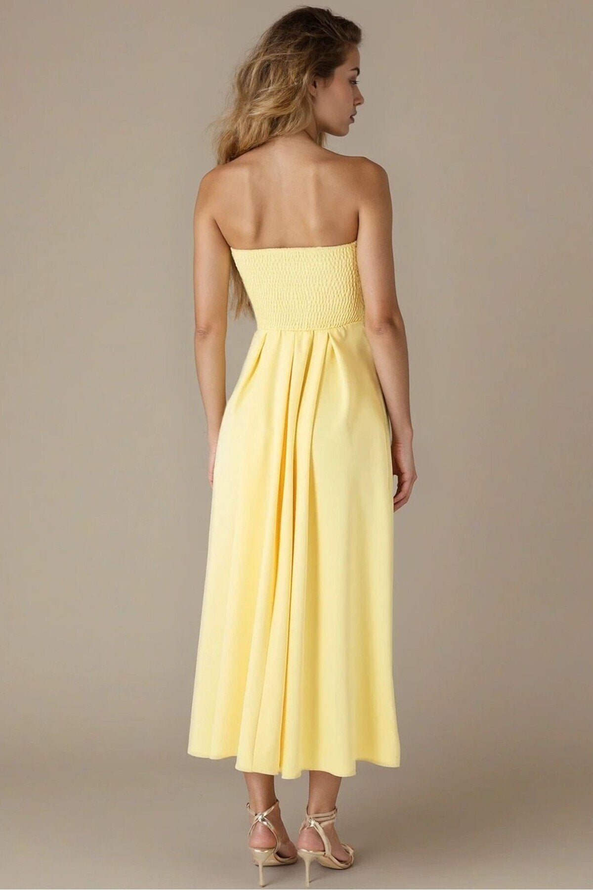 - Straplez yaka tasarımı ile feminen bir görünüm sunar ve dekolte bölgesini zarifçe sergiler.; - Orta kalınlıkta polyester kumaşı, rahat bir kullanım sağlarken dayanıklılığı artırır.; - Düğün, nişan ve davet gibi özel günlerinizde şıklığınızı tamamlayacak kloş kesim tasarımıyla dikkat çeker.; - Baskısız düz dokuma kumaşı sayesinde sade ve şık bir görünüm elde edilir.; - Cepsiz tasarımı ile minimalist estetiği ön plana çıkarırken, kemersiz yapısı kolay giyilip çıkarılmasını sağlar.; - Astarsız yapısıyla hafif ve konforlu bir deneyim sunarken, kapsız olması yaz aylarında serinlik sağlar.; - Fermuarlı kapama şekli pratik kullanım imkanı tanırken, gipeli detaylar elbiseye hareket kazandırır.; - Düz desenli ve A kesim siluetiyle her vücut tipine uyum sağlayarak zarif bir duruş sergiler.; - Tekli paket içeriğiyle kolayca saklanabilir ve taşınabilir.; - Türkiye menşeli ürün, yerel üretim desteklenerek sürdürülebilirliğe katkıda bulunur.; - Uzun boyu ile zarif ve asil bir görünüm sunarken, yetişkin yaş grubuna hitap eder.;