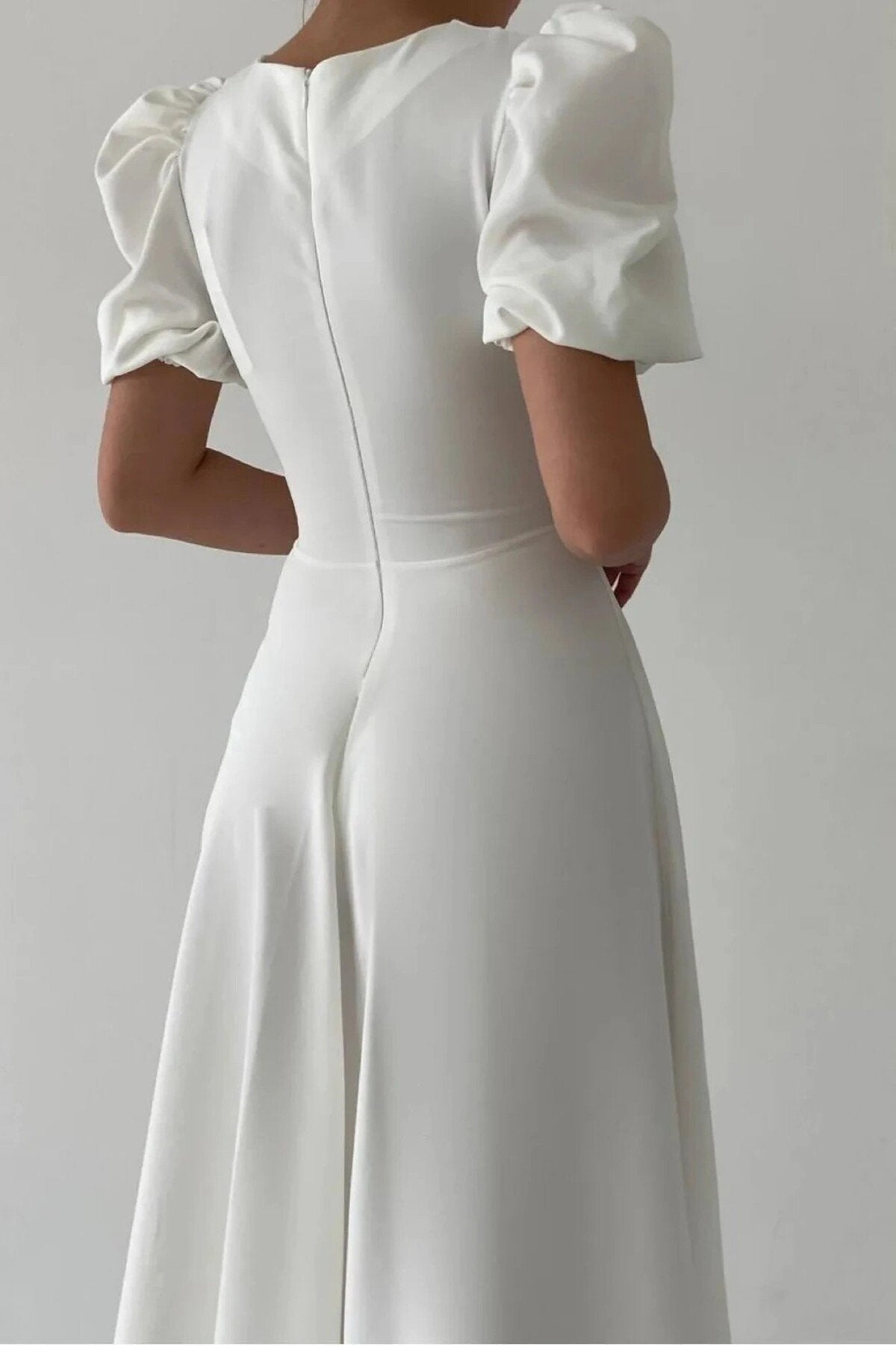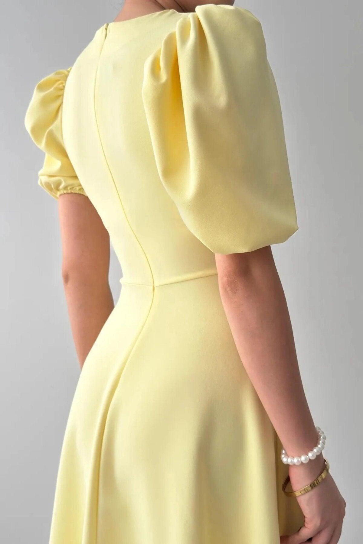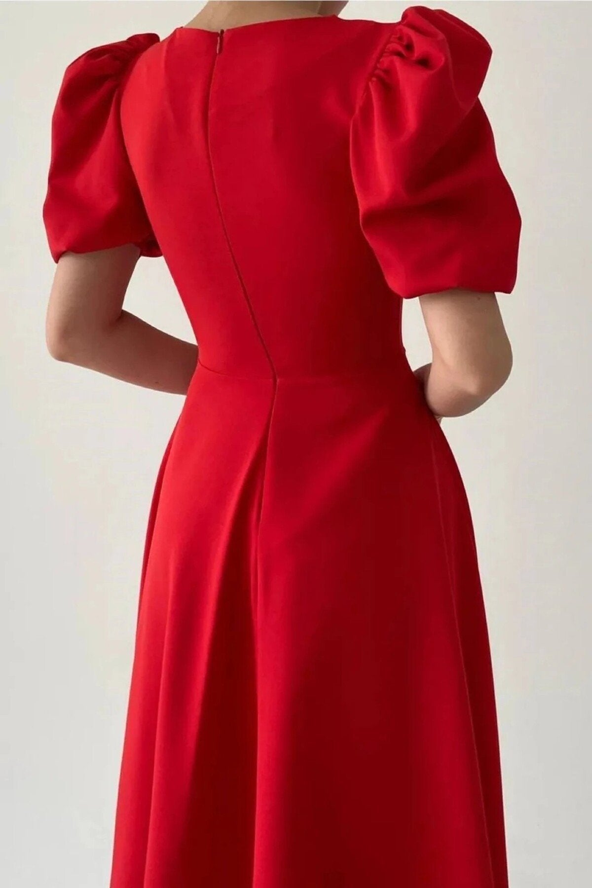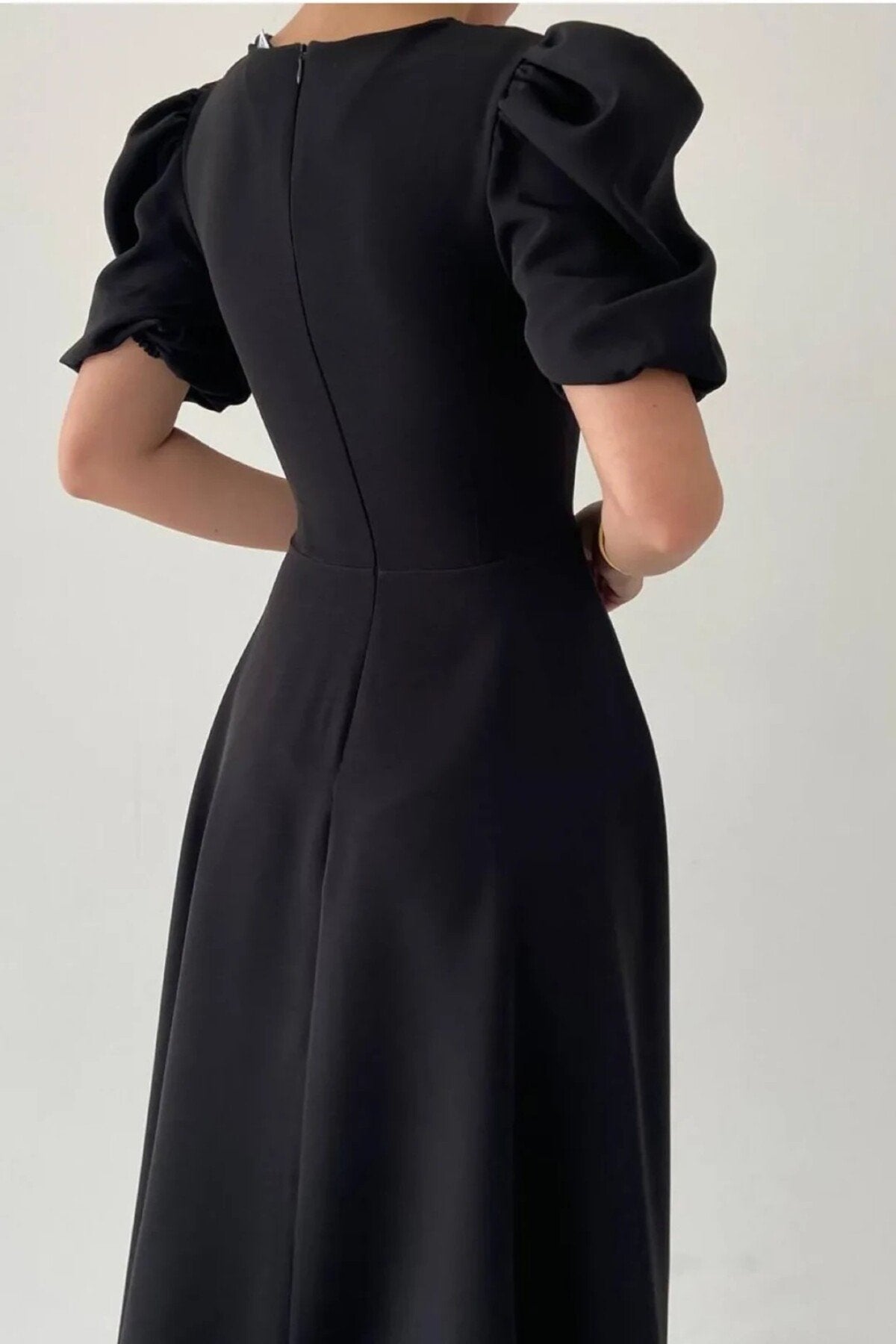 - Zarif tasarımıyla dikkat çeken bu elbise, klasik ve modern çizgileri bir arada sunar.; - Orta kalınlıkta kumaşı ile mevsim geçişlerinde ideal konfor sağlar.; - Fermuar detayı sayesinde kolayca giyilip çıkarılabilir ve pratik kullanım imkanı tanır.; - Sade ve şık görünümüyle her ortamda rahatlıkla tercih edilebilir; gündüzden geceye her anınıza eşlik eder.; - Düz dokuma kumaşı, dayanıklılığı artırırken düz deseniyle zamansız bir stil oluşturur.; - Balon kol tasarımı hem feminen bir hava katarken hem de hareket özgürlüğü sağlar.; - Midi boy kesimiyle hem günlük kullanım hem de özel günler için uygunluk gösterir.; - Astarsız yapısıyla hafif ve ferah bir his verirken, iç göstermez özelliğiyle güven verir.; - Cepsiz tasarım minimalizmi ön plana çıkartarak sofistike bir görünüm kazandırır.; - Kemer detayının olmaması, daha geniş bedenlerde bile vücut hatlarını zarifçe sararak estetik bir siluet oluşturur.; - Tüm sezonlarda rahatlıkla tercih edebileceğiniz bu elbise, gardrobunuzun vazgeçilmez parçalarından biri haline gelecek.