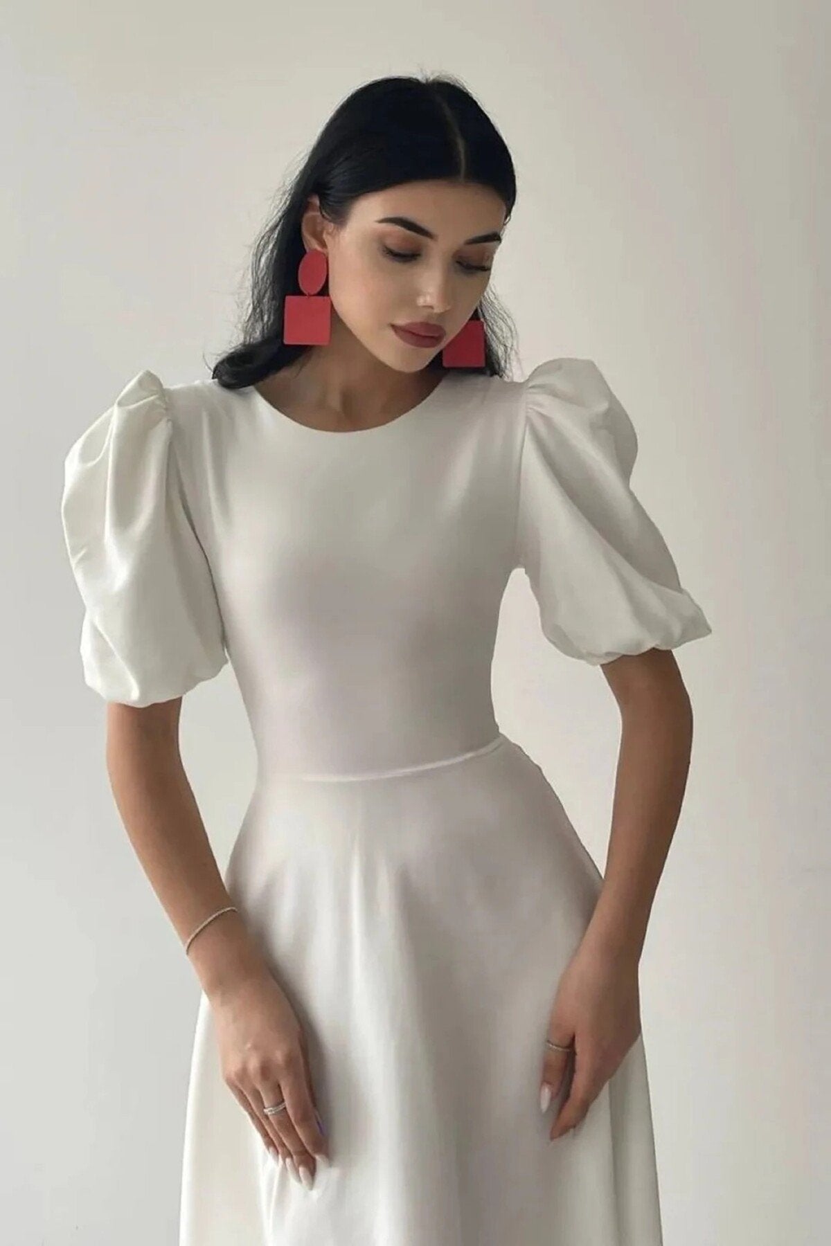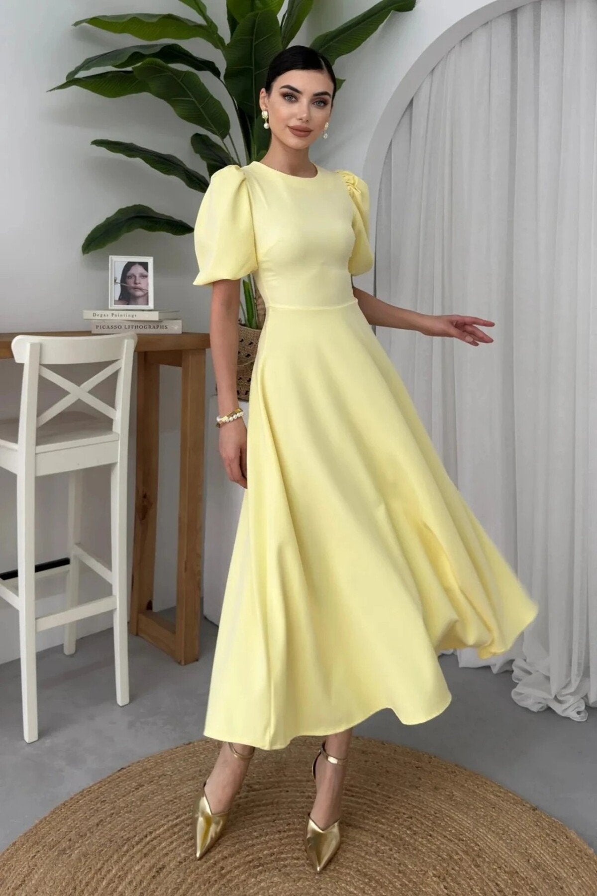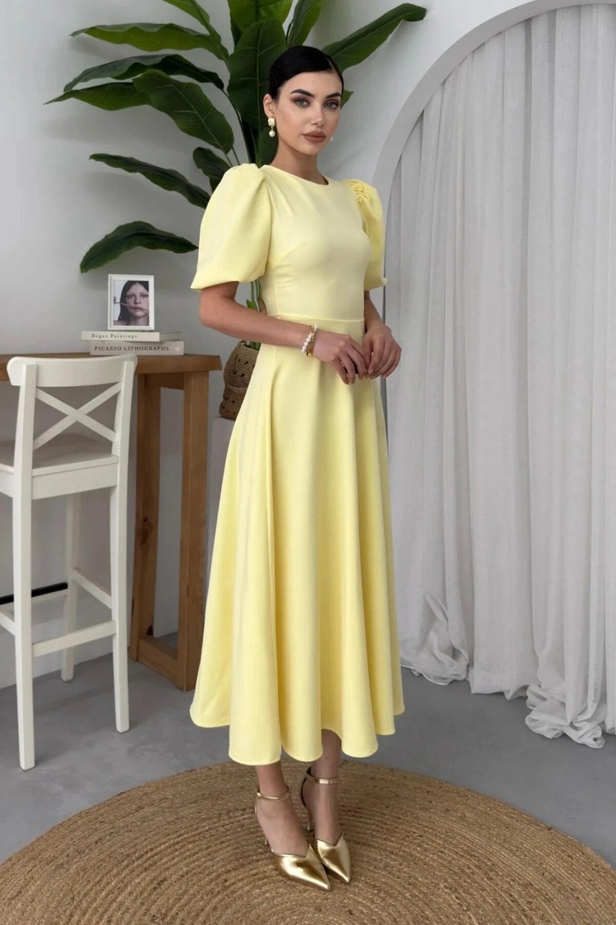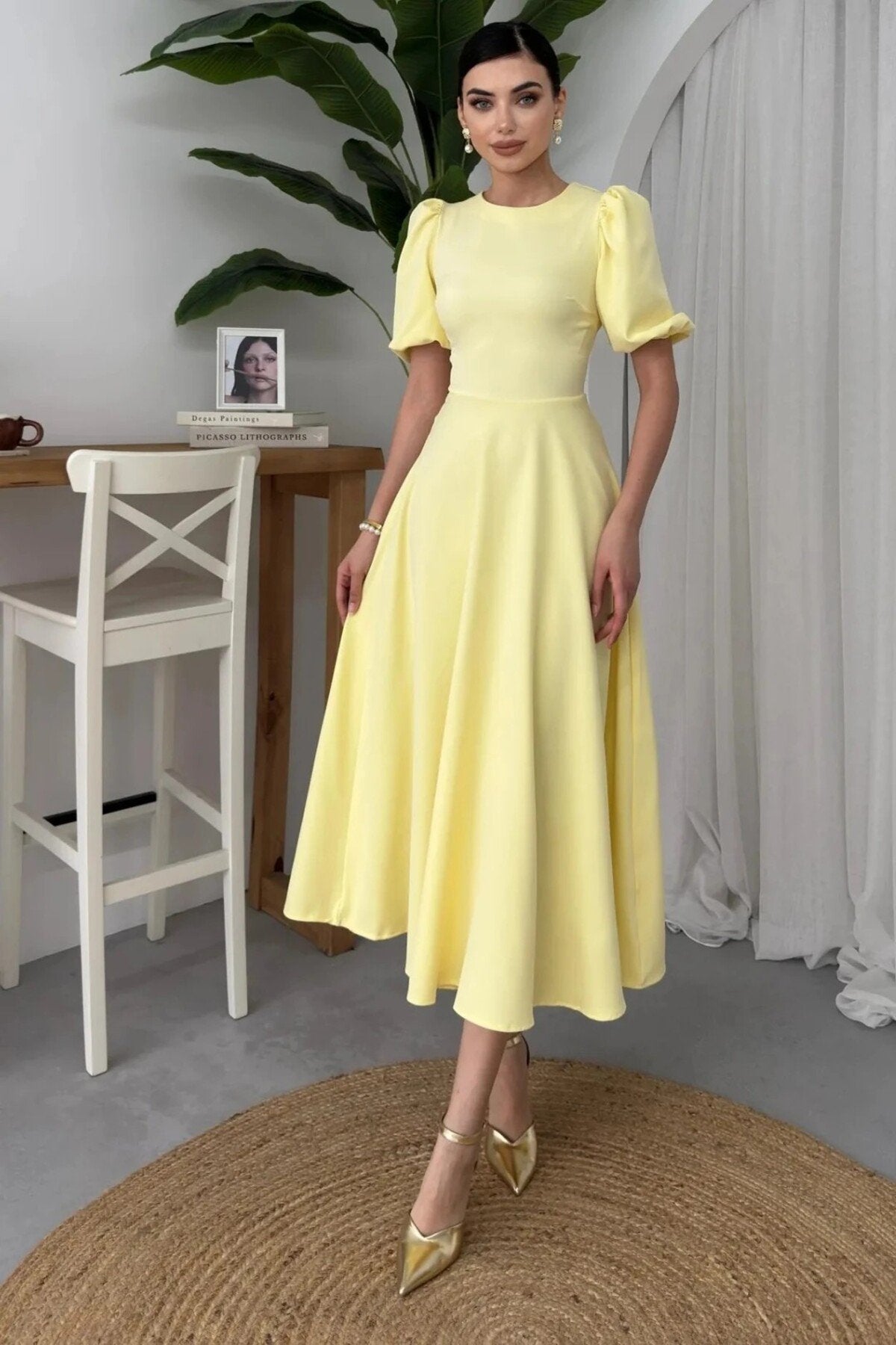 - Zarif tasarımıyla dikkat çeken bu elbise, klasik ve modern çizgileri bir arada sunar.; - Orta kalınlıkta kumaşı ile mevsim geçişlerinde ideal konfor sağlar.; - Fermuar detayı sayesinde kolayca giyilip çıkarılabilir ve pratik kullanım imkanı tanır.; - Sade ve şık görünümüyle her ortamda rahatlıkla tercih edilebilir; gündüzden geceye her anınıza eşlik eder.; - Düz dokuma kumaşı, dayanıklılığı artırırken düz deseniyle zamansız bir stil oluşturur.; - Balon kol tasarımı hem feminen bir hava katarken hem de hareket özgürlüğü sağlar.; - Midi boy kesimiyle hem günlük kullanım hem de özel günler için uygunluk gösterir.; - Astarsız yapısıyla hafif ve ferah bir his verirken, iç göstermez özelliğiyle güven verir.; - Cepsiz tasarım minimalizmi ön plana çıkartarak sofistike bir görünüm kazandırır.; - Kemer detayının olmaması, daha geniş bedenlerde bile vücut hatlarını zarifçe sararak estetik bir siluet oluşturur.; - Tüm sezonlarda rahatlıkla tercih edebileceğiniz bu elbise, gardrobunuzun vazgeçilmez parçalarından biri haline gelecek.
