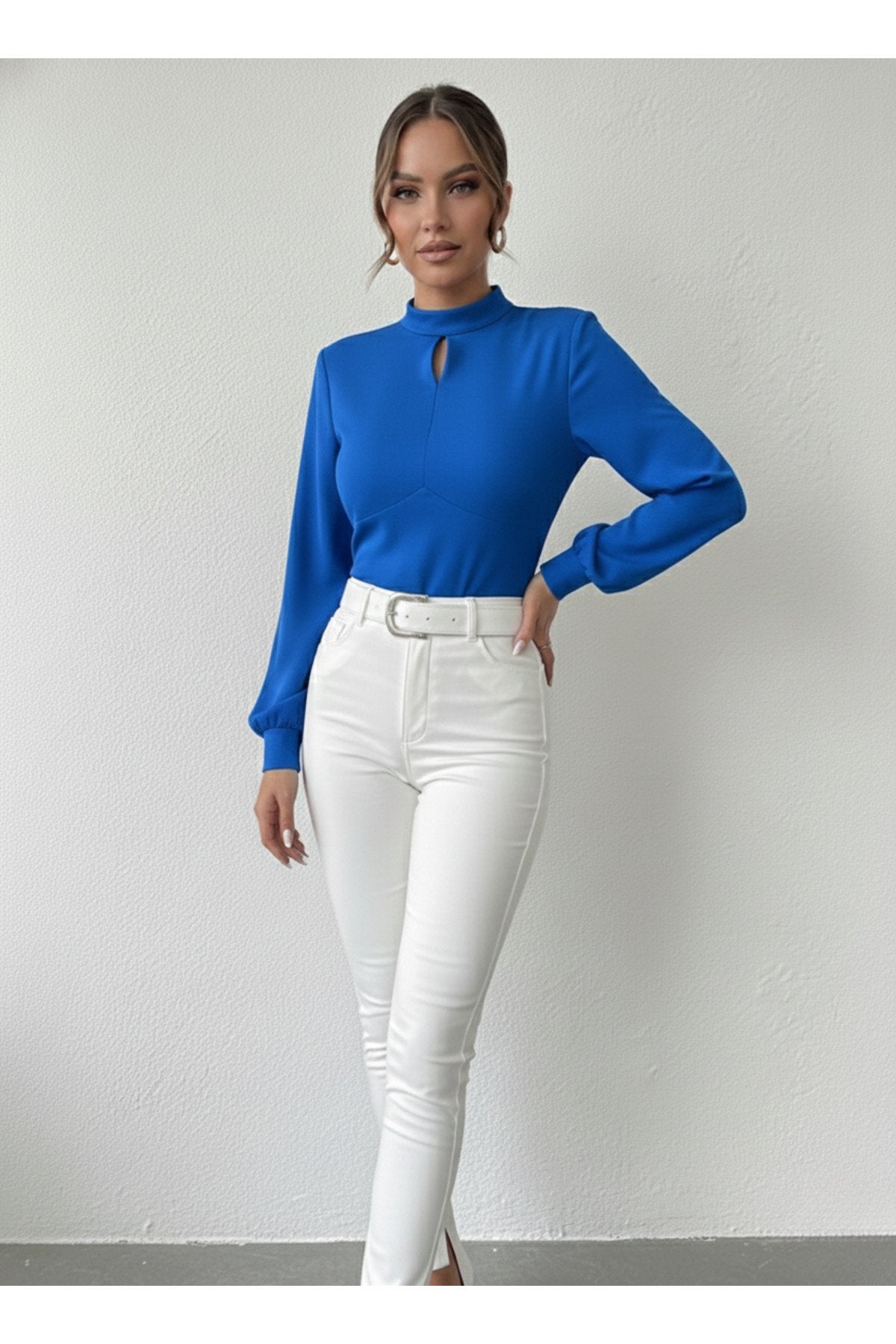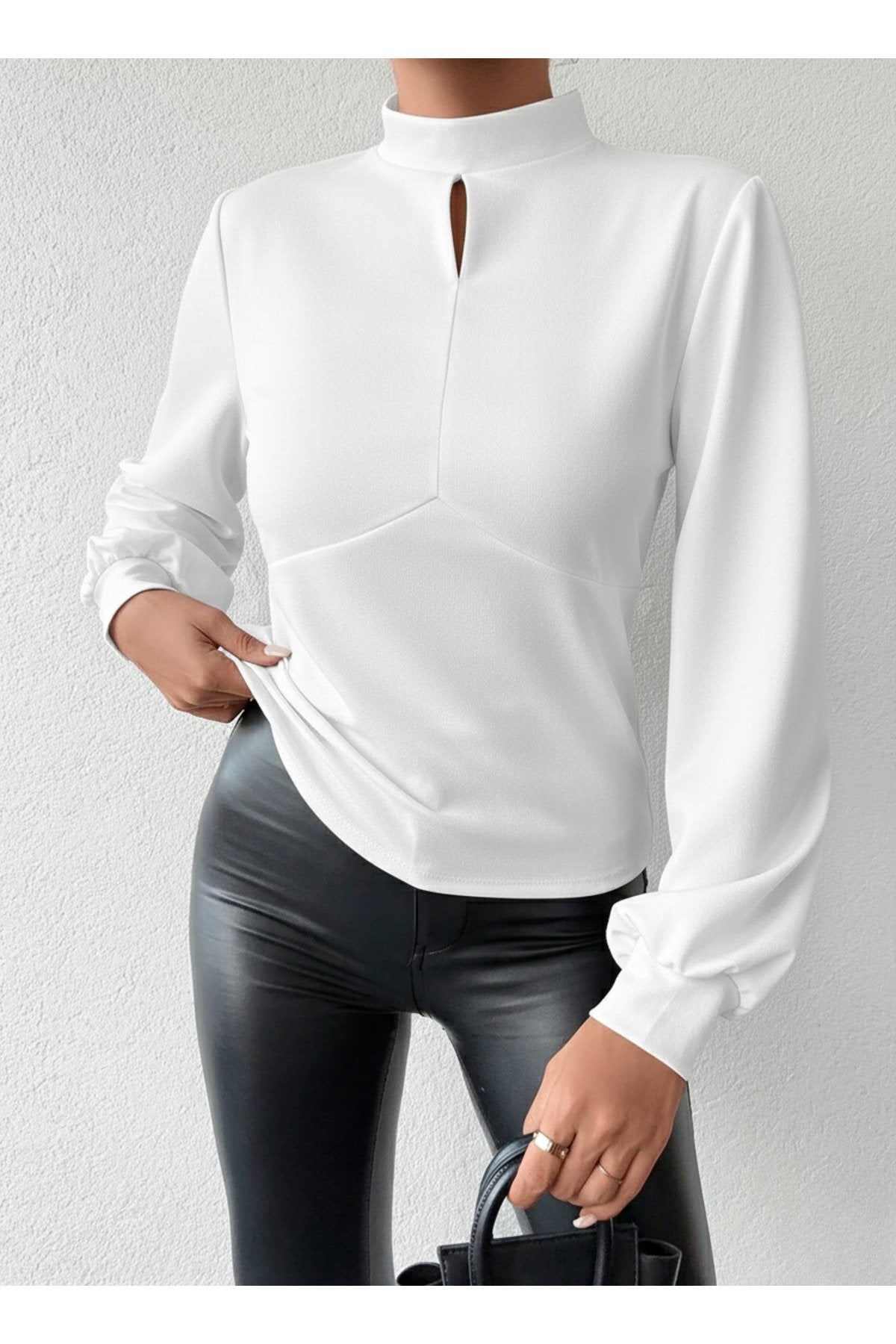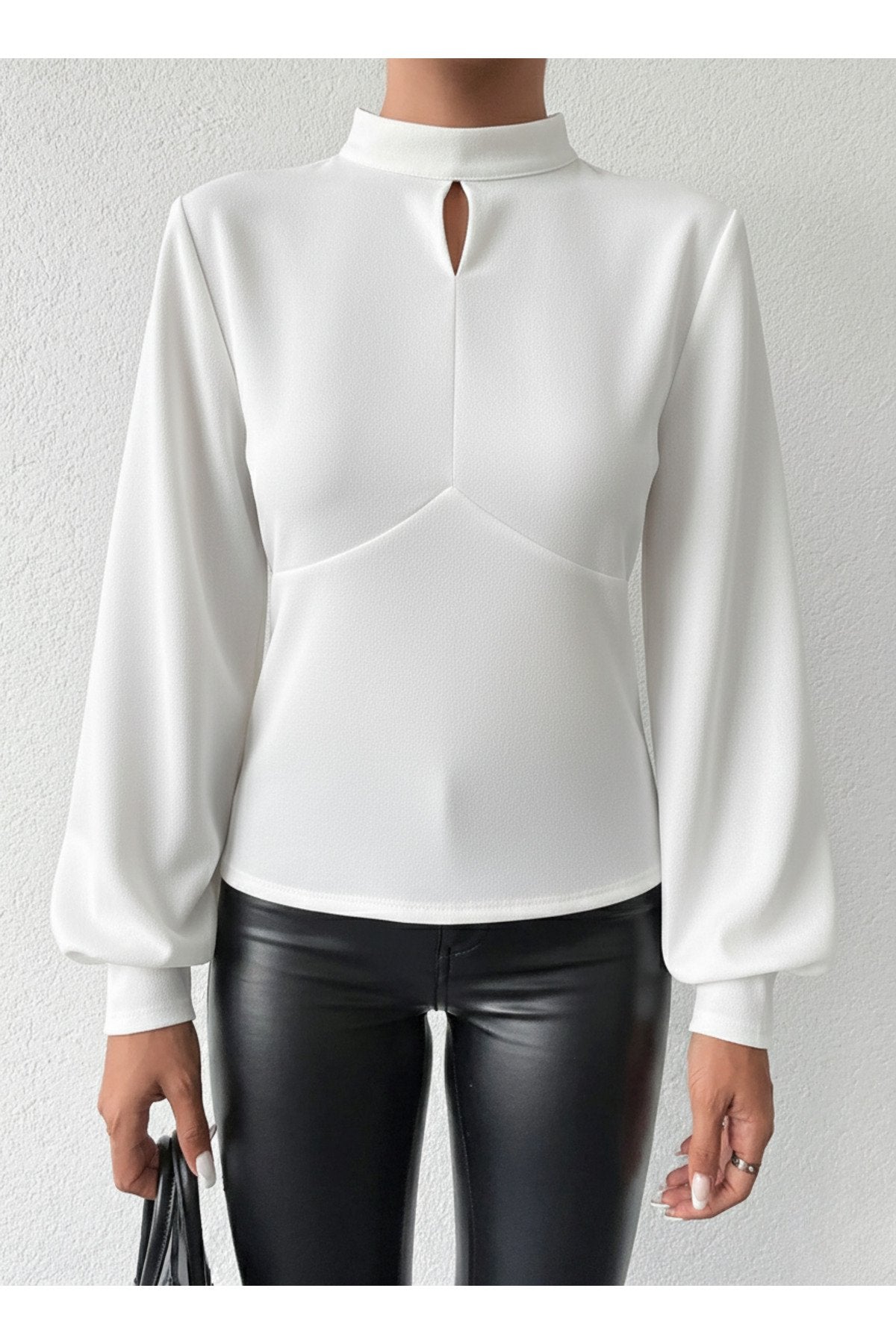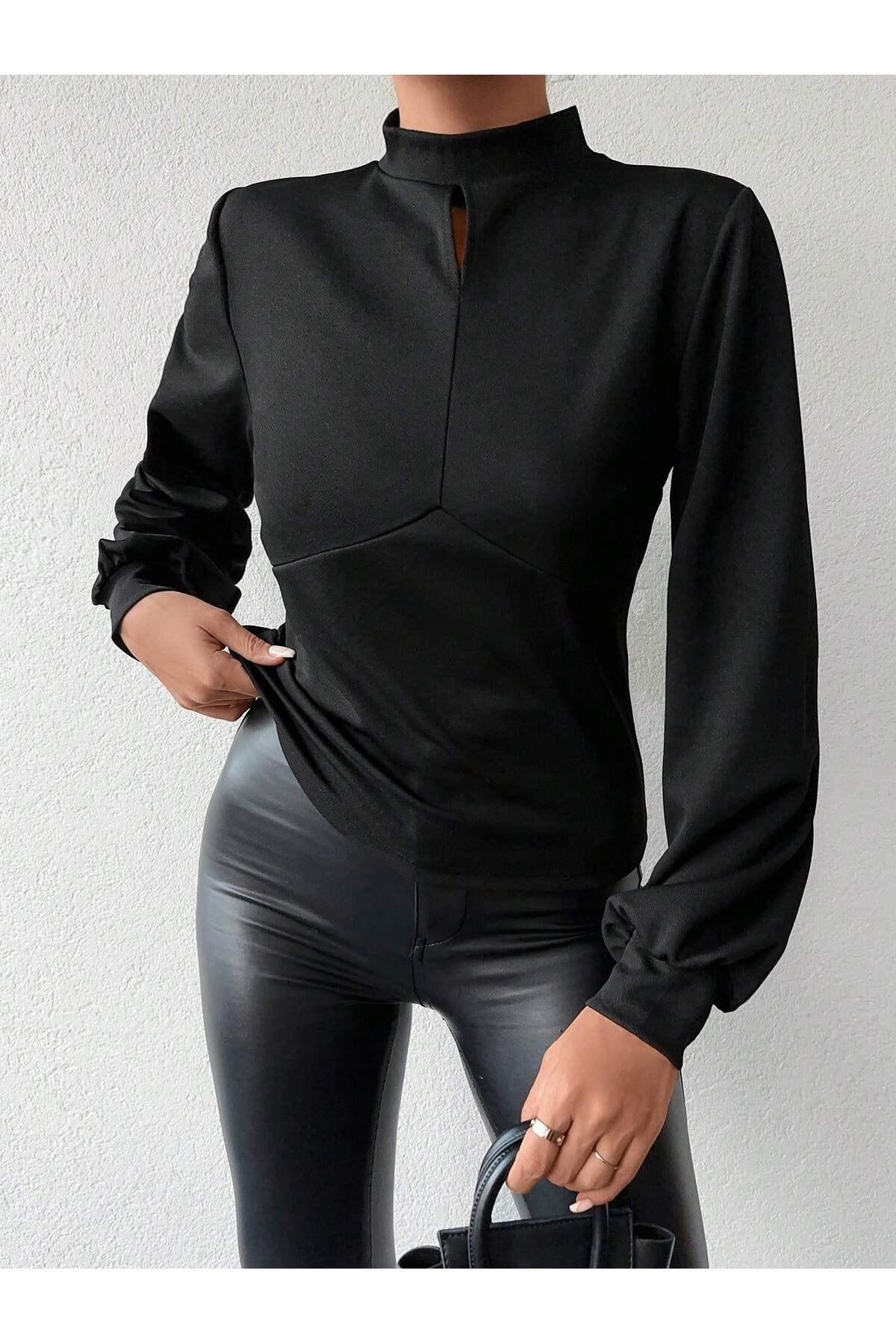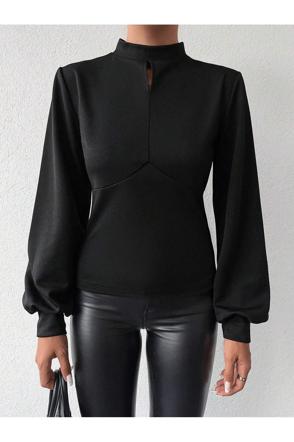 - Dik yaka tasarımı ile modern ve şık bir görünüm sunar.; - Tek parça halinde gelen bu bluz, gardırobunuzda kolayca yerini alır.; - Pratik düğmeli kapama şekli sayesinde giyip çıkarması rahattır.; - Balon kol detayı ile feminen ve zarif bir siluet çizer.; - Düz deseniyle sade ve şık bir tarz yaratmanızı sağlar.; - Uzun kol boyu, mevsim geçişlerinde ideal koruma sunar.; - Cut out detayı ile modern ve dinamik bir hava katar.; - Scuba Krep dokuma tipi, dayanıklılık ve konforu bir arada sunar.; - Baskısız tasarımıyla zamansız bir şıklık yaratır.; - Kapsız yapısıyla hafif ve rahat bir kullanım sağlar.; - Basic siluetiyle her tür alt giyimle kolayca kombinlenebilir.; - Orta kalınlıkta kumaşı sayesinde mevsim geçişlerinde idealdir.; - Cut out detayları ile dikkat çekici bir görünüm kazandırır.;