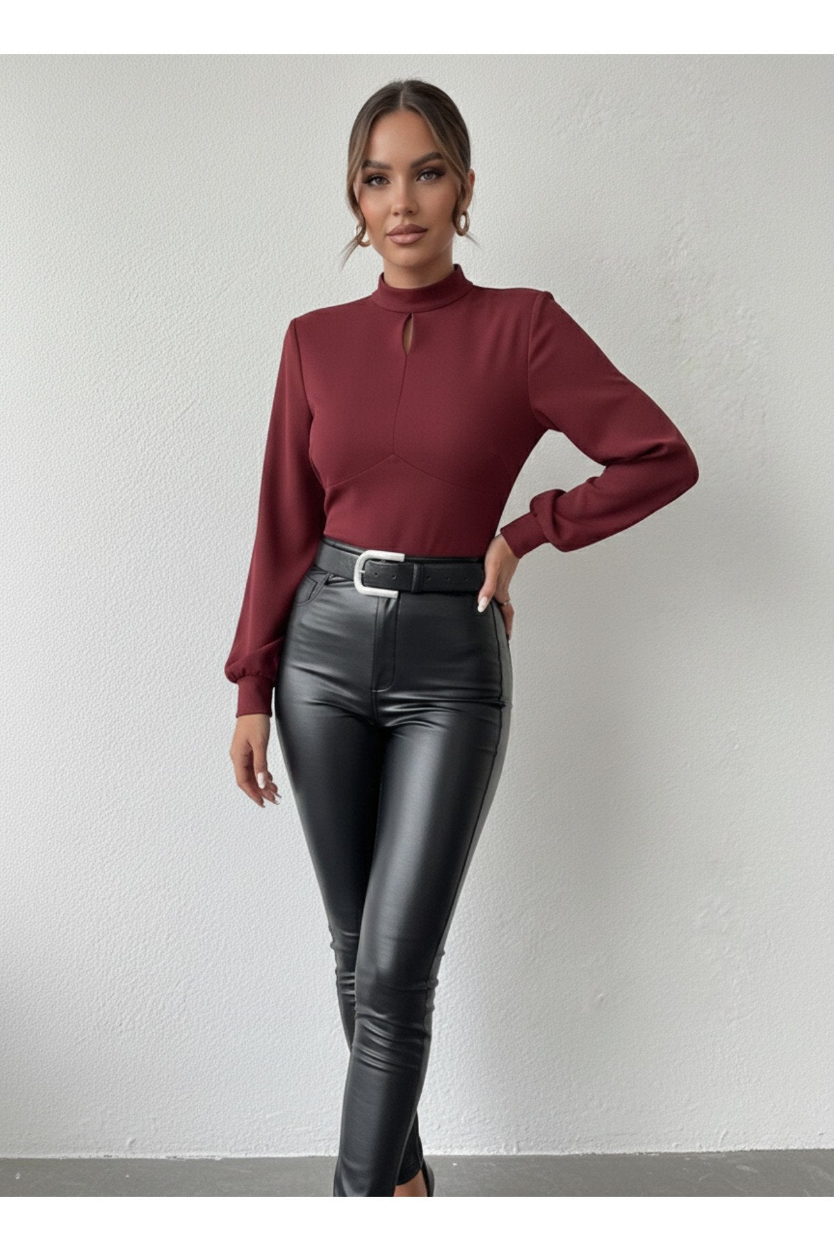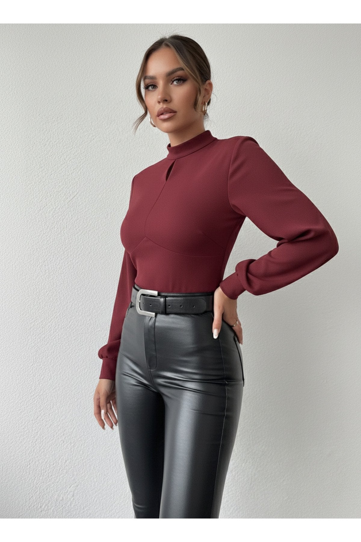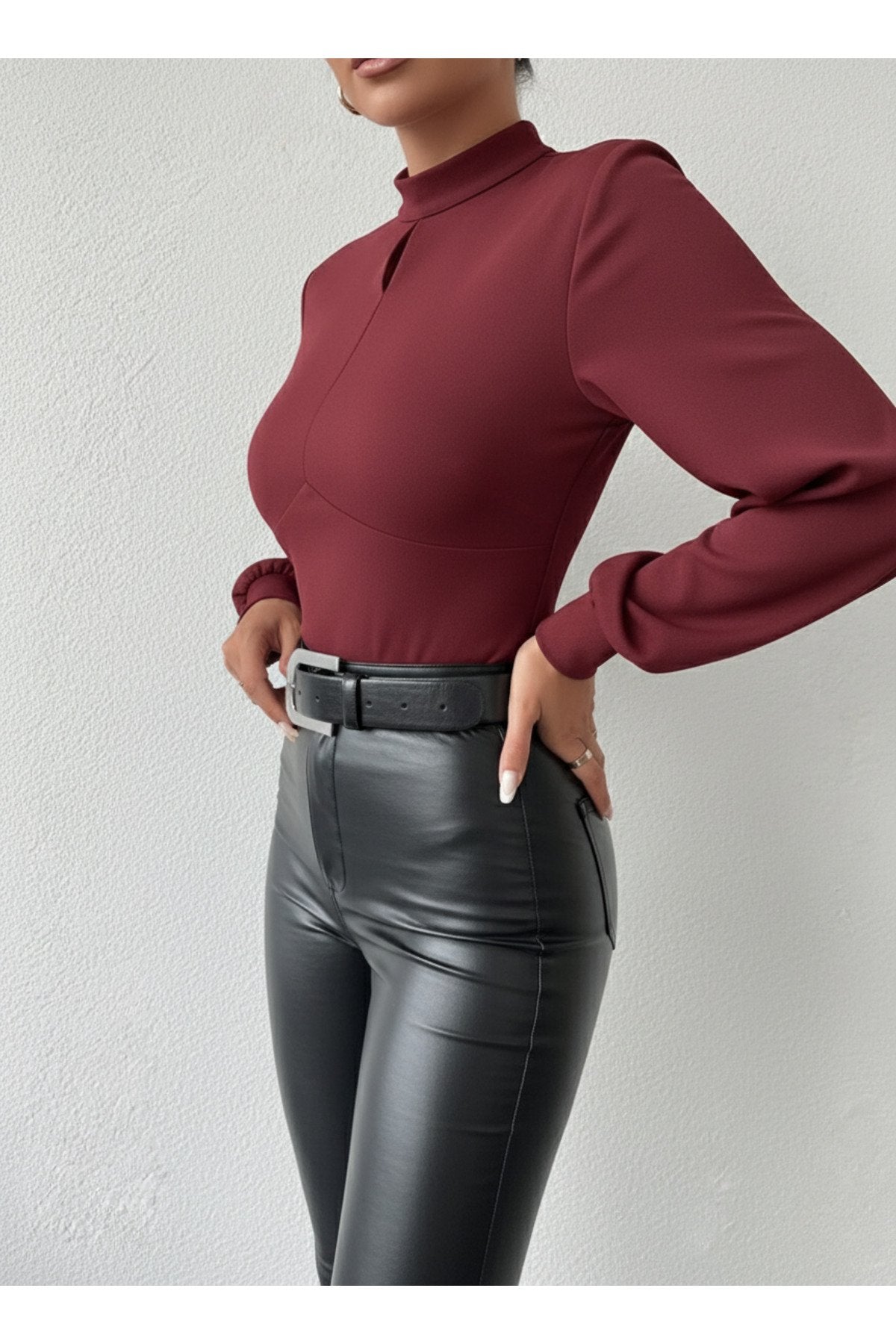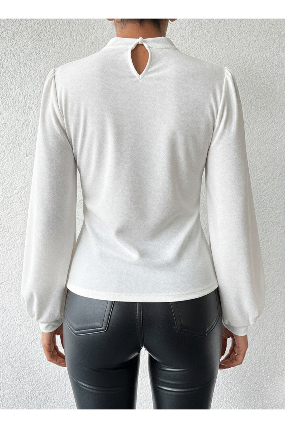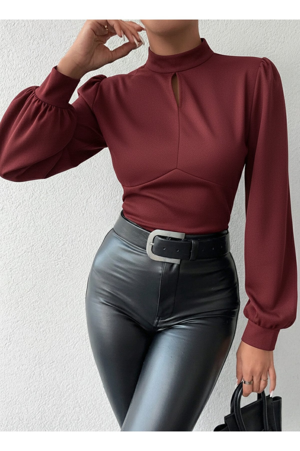 - Dik yaka tasarımı ile modern ve şık bir görünüm sunar.; - Tek parça halinde gelen bu bluz, gardırobunuzda kolayca yerini alır.; - Pratik düğmeli kapama şekli sayesinde giyip çıkarması rahattır.; - Balon kol detayı ile feminen ve zarif bir siluet çizer.; - Düz deseniyle sade ve şık bir tarz yaratmanızı sağlar.; - Uzun kol boyu, mevsim geçişlerinde ideal koruma sunar.; - Cut out detayı ile modern ve dinamik bir hava katar.; - Scuba Krep dokuma tipi, dayanıklılık ve konforu bir arada sunar.; - Baskısız tasarımıyla zamansız bir şıklık yaratır.; - Kapsız yapısıyla hafif ve rahat bir kullanım sağlar.; - Basic siluetiyle her tür alt giyimle kolayca kombinlenebilir.; - Orta kalınlıkta kumaşı sayesinde mevsim geçişlerinde idealdir.; - Cut out detayları ile dikkat çekici bir görünüm kazandırır.;