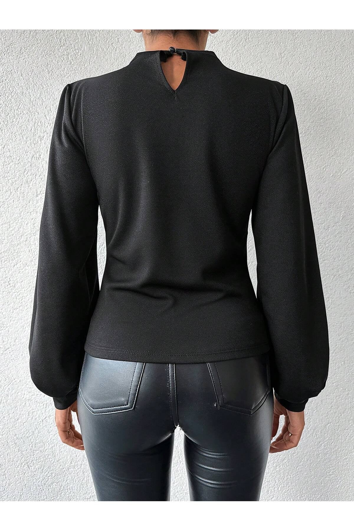 KADIN BALON KOL ÖNÜ DAMLA DETAYLI ESNEK ÖRME KUMAŞ BLUZ