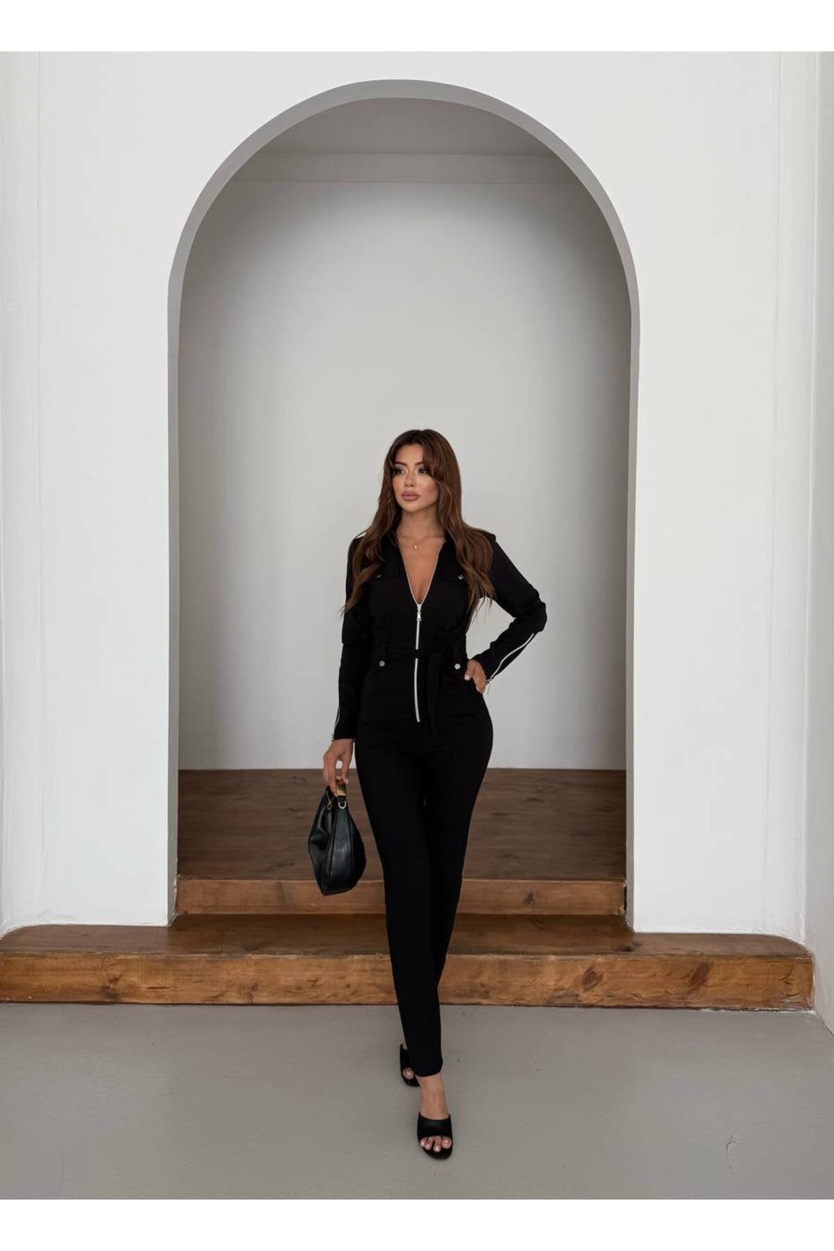 - Bodycone silueti ile vücut hatlarınıza mükemmel uyum sağlar ve şık bir görünüm sunar.; - Dar paça tasarımı sayesinde modern ve trend bir stil yaratırken, rahat hareket etme olanağı tanır.; - Kapsız yapısıyla sade ve minimalist bir görünüm elde edilirken, fermuar detayı ile kolay kullanım sunulur.; - Toparlayıcı özelliği sayesinde vücut hatlarınızı daha belirgin hale getirir ve fit bir görünüm sağlar.; - Kuşak detayı belinizi vurgulayarak zarif bir siluet oluştururken, düz deseniyle her ortama uyum sağlar.; - Fashion Forward persona\'ya hitap eden bu tasarım, trendleri takip eden kadınların gardırobunda yerini alacak.; - Polyester materyal kullanımı sayesinde dayanıklılık ve uzun ömürlülük sunarken, düz dokuma tipi ile konforlu bir kullanım vaat eder.; - Fermuarlı kapama şekli pratik kullanım imkanı sağlarken, uzun kol tasarımı mevsim geçişlerinde idealdir.; - İlkbahar / Sonbahar sezonuna uygun olarak tasarlanan bu tulum, partilerde ve özel davetlerde şıklığınızı tamamlar.; - Gömlek yaka detayıyla sofistike bir dokunuş katarken, çift cepli yapısı fonksiyonelliği artırır.;