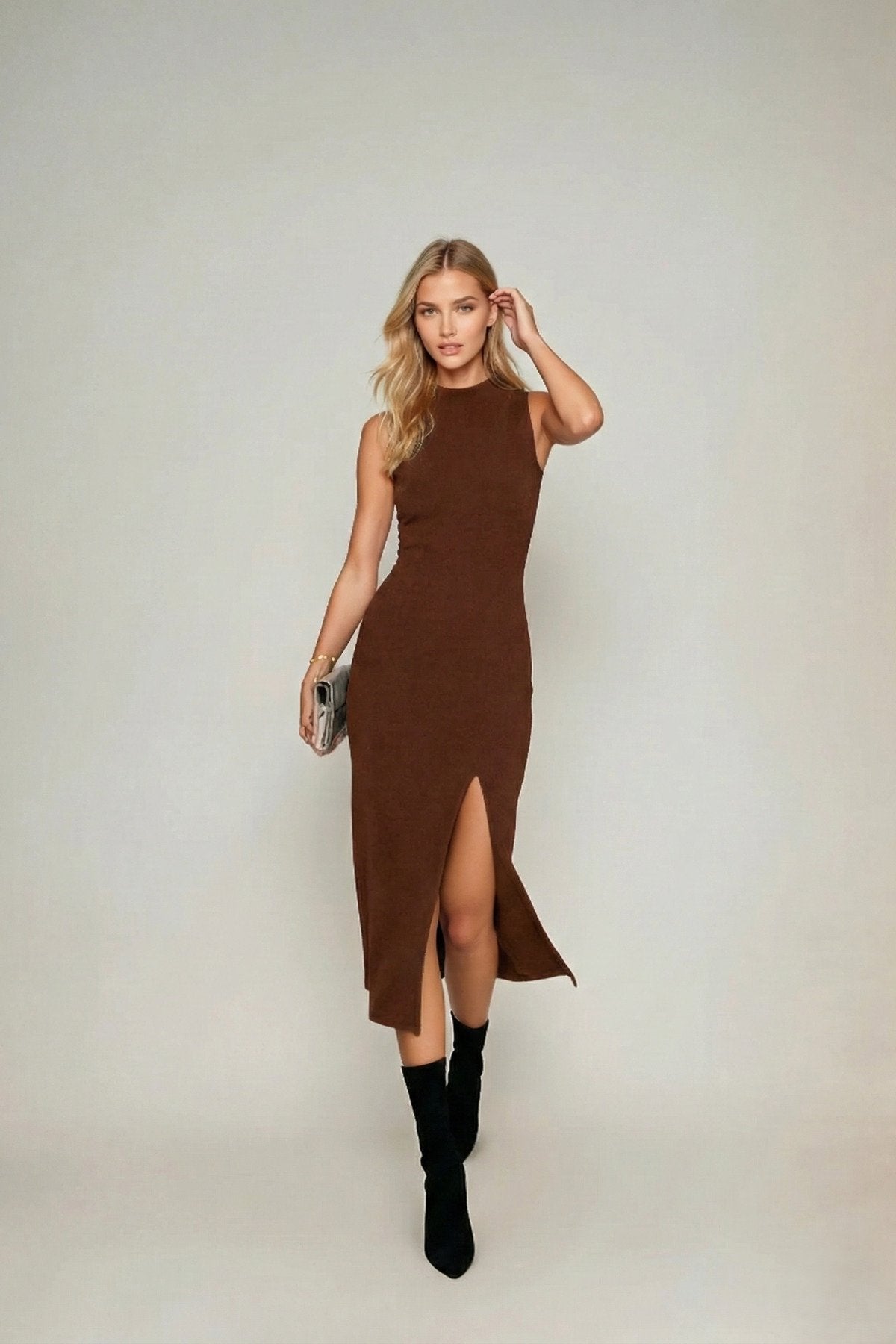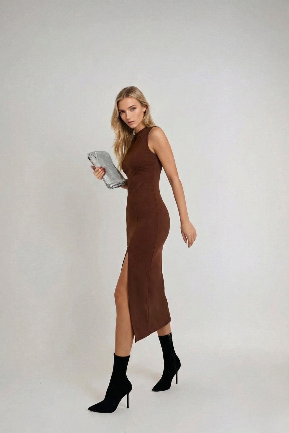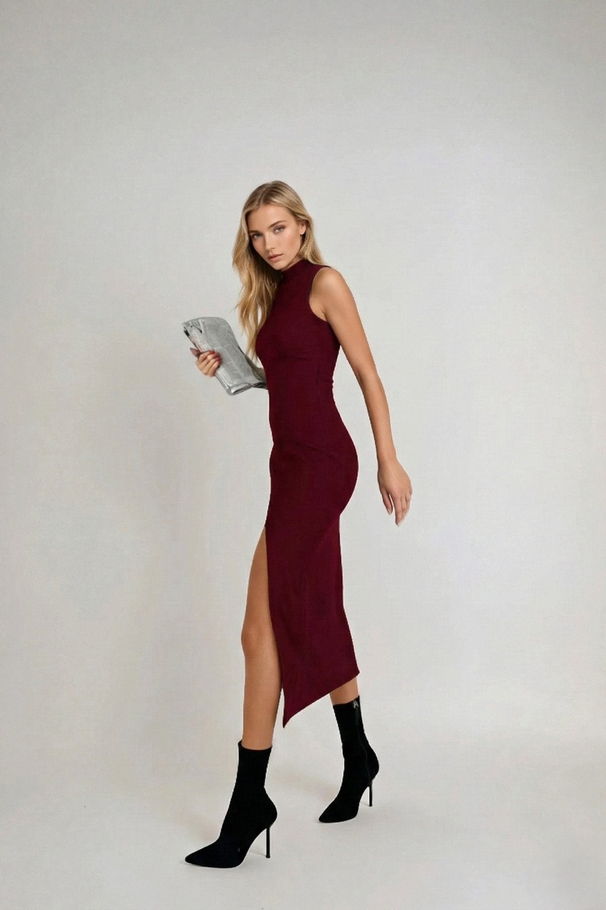 KADIN DİK YAKA KOLSUZ ESNEK KUMAŞ YIRTMAÇLI ELBİSE