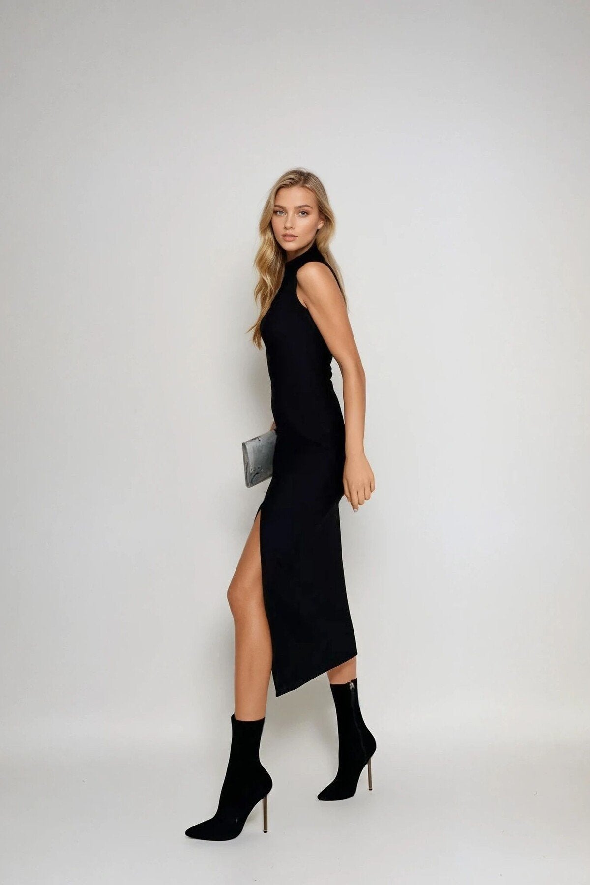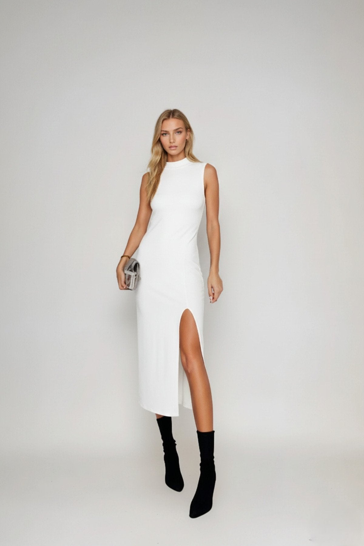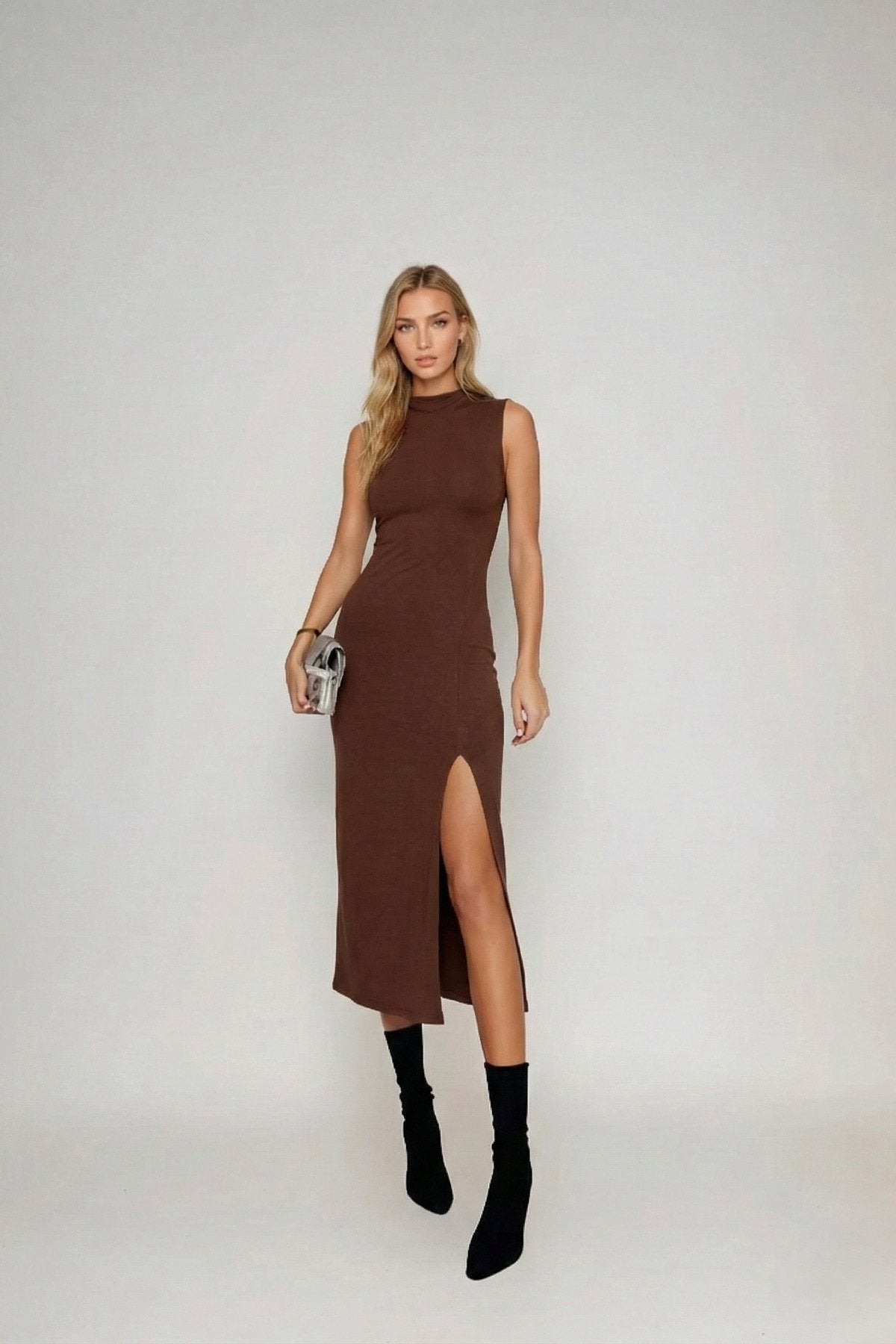 KADIN DİK YAKA KOLSUZ ESNEK KUMAŞ YIRTMAÇLI ELBİSE