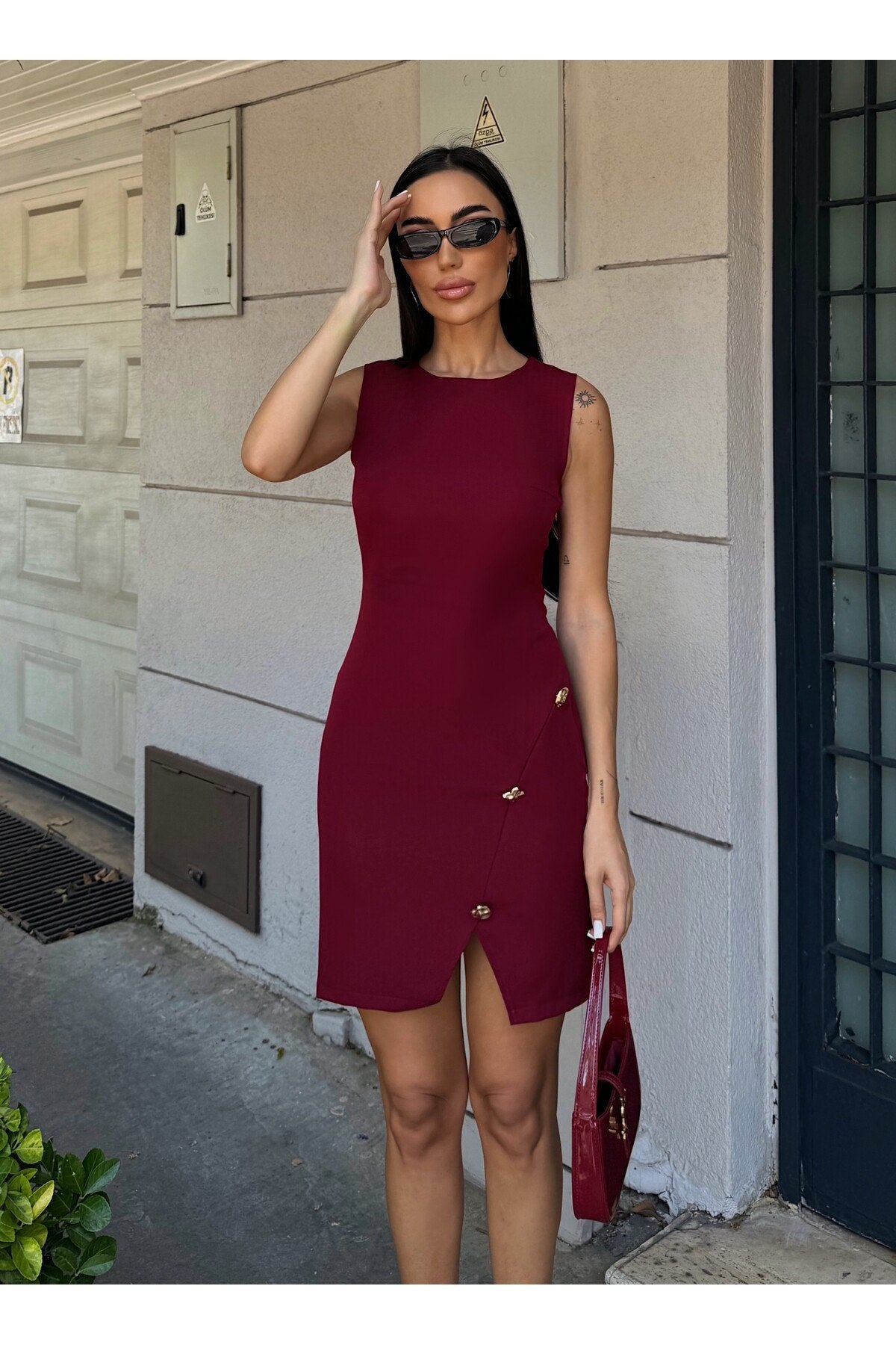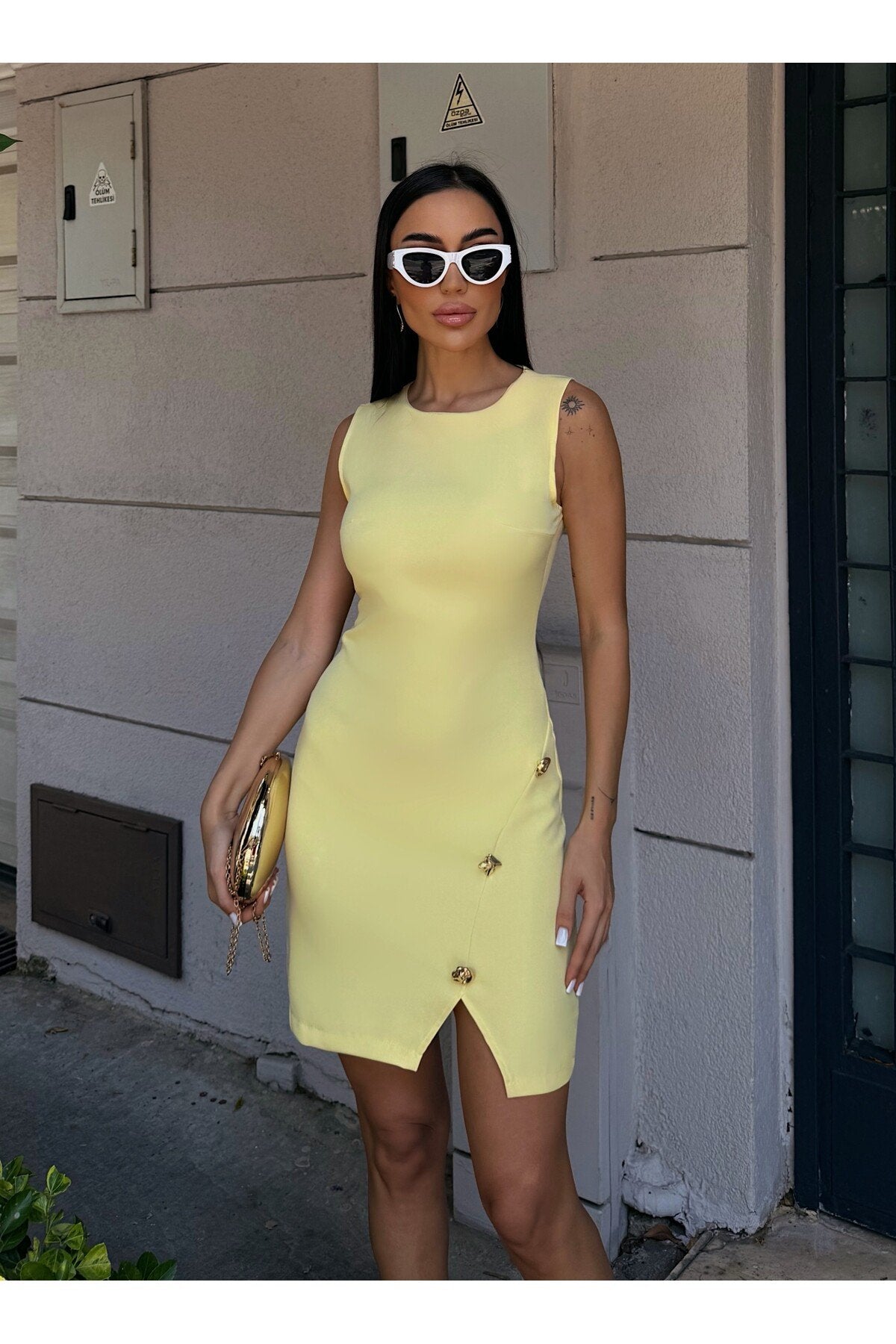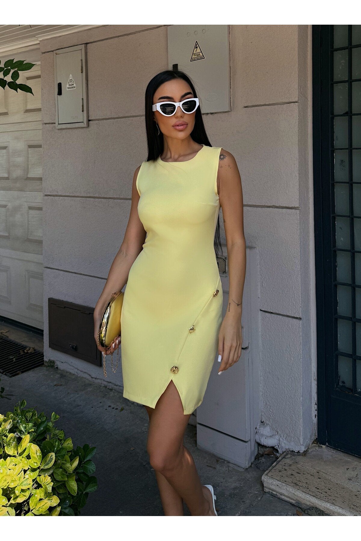 - Maksimum 30°C\'de yıkanabilir, ağartıcı kullanılmadan ve tamburda kurutulmadan temizlenebilir.; - Orta sıcaklıkta ütülenmesi önerilir; kuru temizleme yapılmamalıdır.; - Yaz sezonuna uygun tasarımıyla hem gündüz hem de gece şıklığınızı tamamlar.; - Baskısız ve düz dokuma kumaşı ile sade ve zarif bir görünüm sunar.; - Kemersiz silueti sayesinde rahat bir kullanım sağlar ve vücut hatlarınıza mükemmel uyum sağlar.; - Kalem kesimiyle feminen bir duruş sergilerken, yırtmaç detayı hareket özgürlüğü tanır.; - Cepsiz yapısıyla minimalist tasarım anlayışını benimserken, düğmeli detaylarıyla şıklık kazandırır.; - %100 polyester materyali dayanıklılığı arttırırken kolay bakım imkanı sunar.; - Astarsız oluşu hafifliğiyle konforlu bir deneyim vaat ederken, kısa boyu modern trendleri yansıtır.; - Slim fit kalıbıyla vücuda oturan bu elbise, zarifliğinizi ön plana çıkarmak için idealdir.; - Kolsuz tasarımı yaz ayları için idealdir; serin tutarken şık görünmenizi sağlar.; - Yuvarlak yakası ile sofistike bir stil oluşturur.;