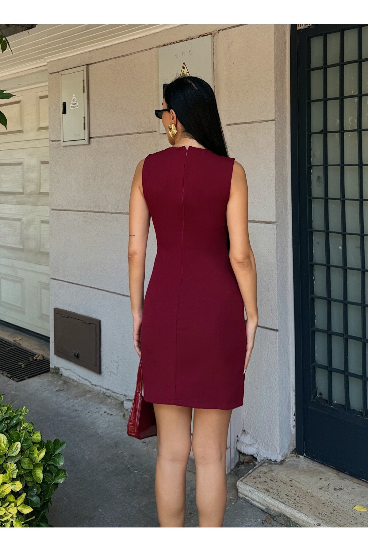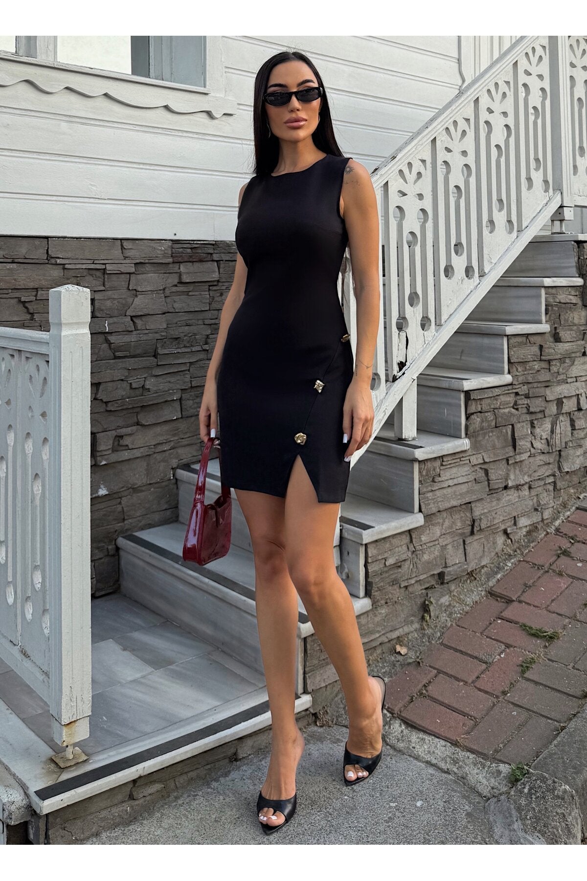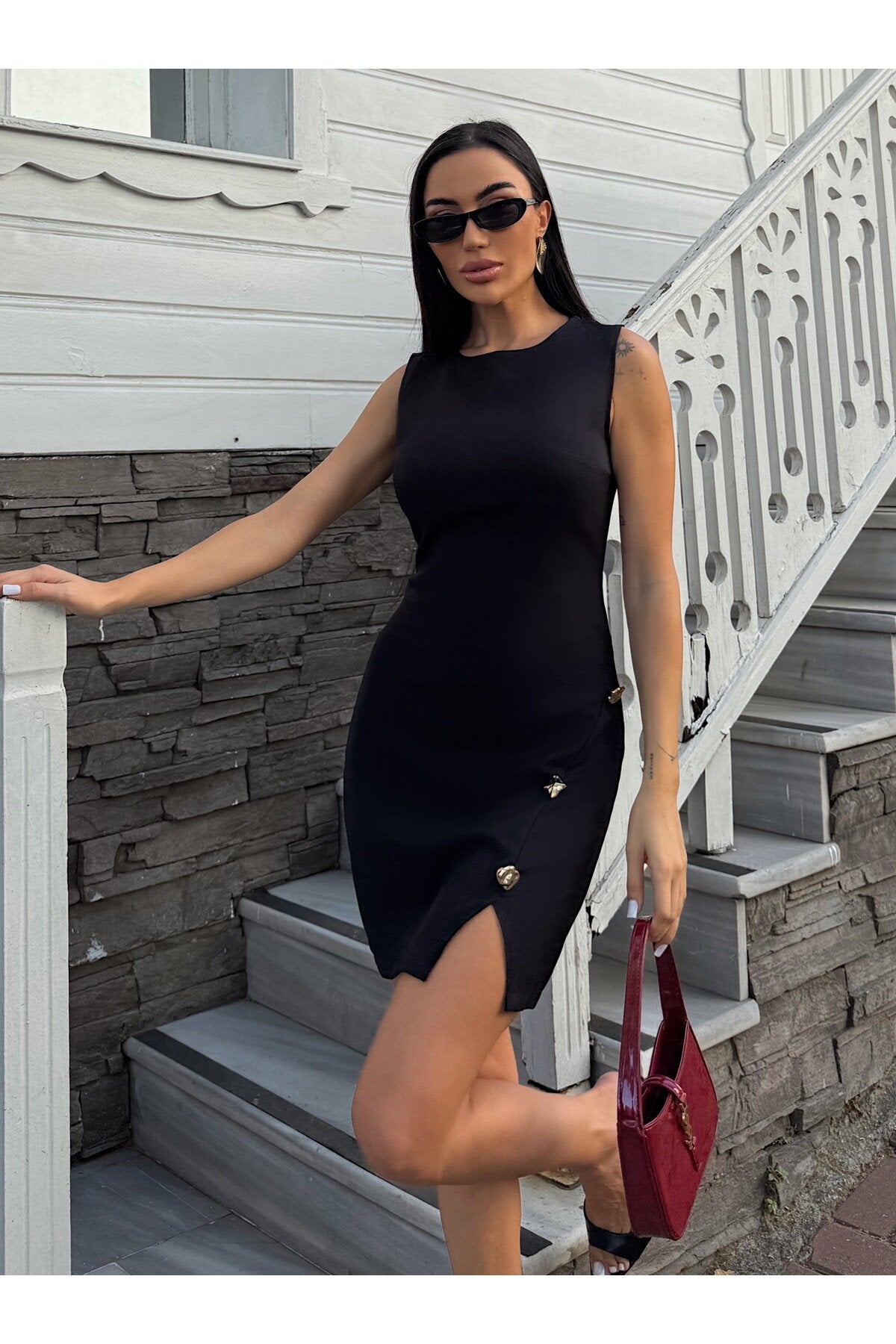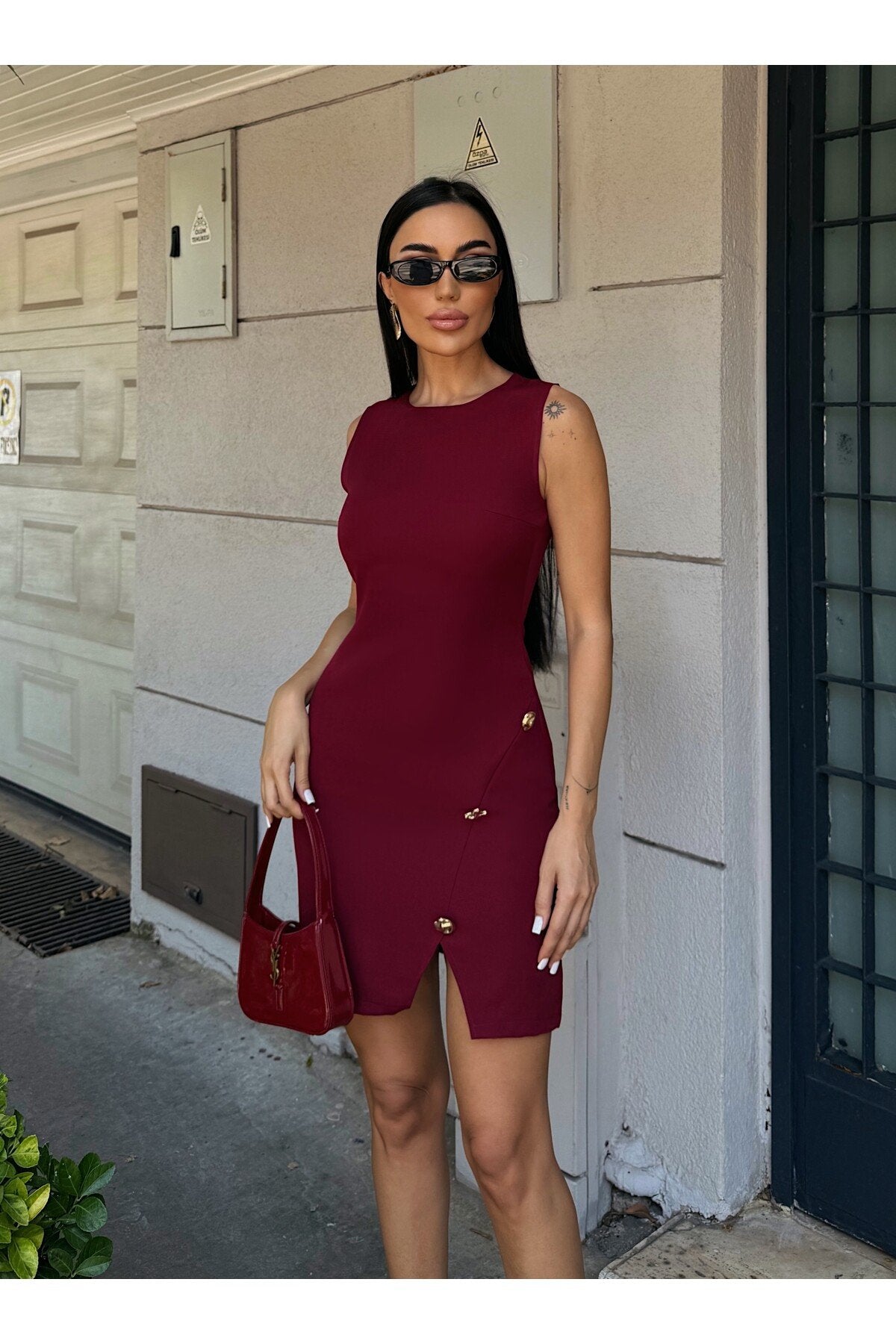 - Maksimum 30°C\'de yıkanabilir, ağartıcı kullanılmadan ve tamburda kurutulmadan temizlenebilir.; - Orta sıcaklıkta ütülenmesi önerilir; kuru temizleme yapılmamalıdır.; - Yaz sezonuna uygun tasarımıyla hem gündüz hem de gece şıklığınızı tamamlar.; - Baskısız ve düz dokuma kumaşı ile sade ve zarif bir görünüm sunar.; - Kemersiz silueti sayesinde rahat bir kullanım sağlar ve vücut hatlarınıza mükemmel uyum sağlar.; - Kalem kesimiyle feminen bir duruş sergilerken, yırtmaç detayı hareket özgürlüğü tanır.; - Cepsiz yapısıyla minimalist tasarım anlayışını benimserken, düğmeli detaylarıyla şıklık kazandırır.; - %100 polyester materyali dayanıklılığı arttırırken kolay bakım imkanı sunar.; - Astarsız oluşu hafifliğiyle konforlu bir deneyim vaat ederken, kısa boyu modern trendleri yansıtır.; - Slim fit kalıbıyla vücuda oturan bu elbise, zarifliğinizi ön plana çıkarmak için idealdir.; - Kolsuz tasarımı yaz ayları için idealdir; serin tutarken şık görünmenizi sağlar.; - Yuvarlak yakası ile sofistike bir stil oluşturur.;