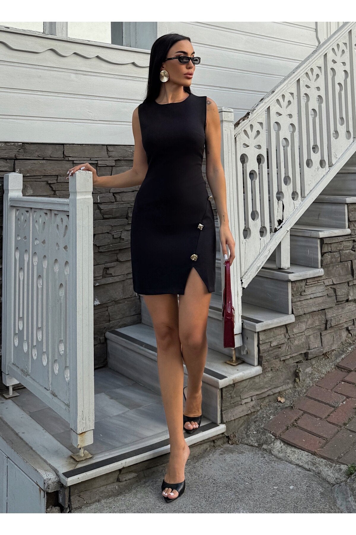 KADIN DÜĞME DETAYLI KOLSUZ YIRTMAÇLI ATLAS KUMAŞ ELBİSE