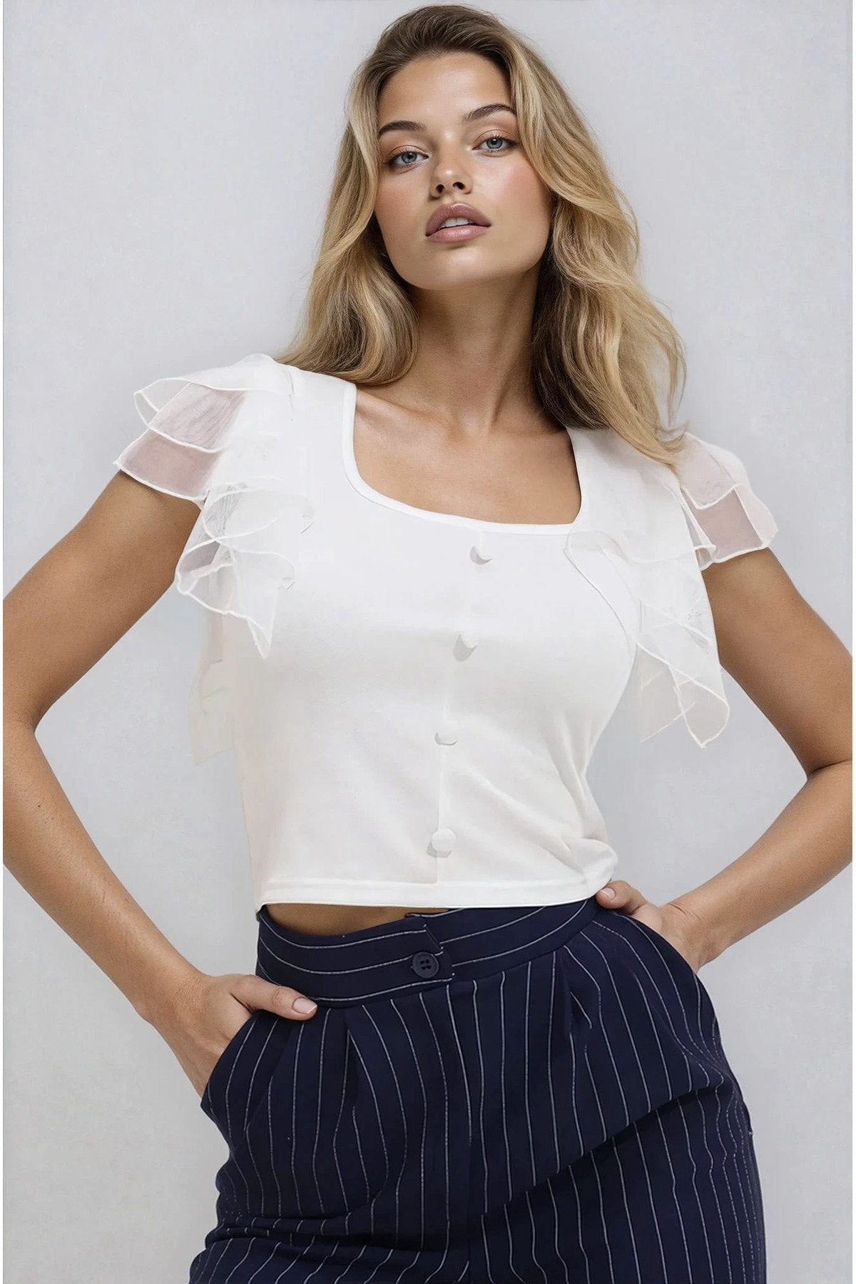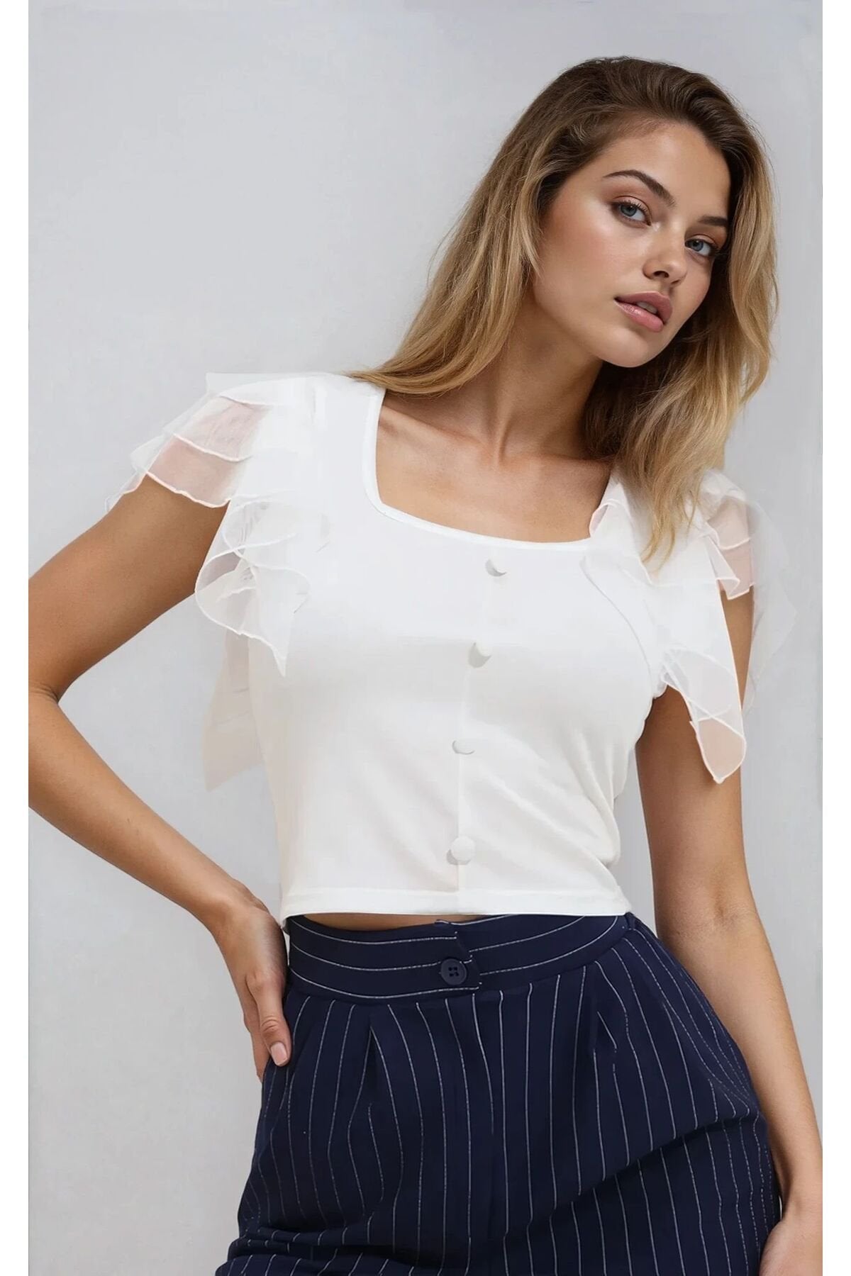 - Zarif düğme detayları ile şıklığı ön plana çıkaran bu bluz, günlük kullanımda rahatlık sağlar.; - Esnek örme kumaşı sayesinde vücut hatlarınıza mükemmel uyum sağlayarak konforlu bir deneyim sunar.; - Genç ve dinamik tarzınızı yansıtan crop kesimiyle modern bir görünüm kazandırır.; - Kısa kollu tasarımı yaz ayları için idealdir; serin tutarken stil sahibi olmanızı sağlar.; - U yaka tipi ile feminen çizgileri ön plana çıkarırken, beyaz rengi her kombininize kolayca uyum sağlar.; - %100 polyester materyali sayesinde dayanıklılığı artırırken bakımı da oldukça basittir.; - Düğmeli kapama şekli pratik kullanım imkanı tanırken, kemer veya kuşak ihtiyacını ortadan kaldırır.; - Sade ve düz deseniyle zamansız parçalar arasında yerini alır; farklı aksesuarlarla zenginleştirilebilir.; - Tekli paketiyle minimalist yaklaşımı benimseyenler için idealdir; ekstra eşyalar taşıma derdi olmadan gardrobunuzu tamamlamanız mümkündür.; - Kısa kol tipiyle mevsim geçişlerinde de tercih edebileceğiniz çok yönlülük sunar.; - Volanlı/fırfırlı detaylarıyla hareketlilik katarken casual giyimin vazgeçilmez parçasına dönüşür.; - Günlük ortamlarda rahatça tercih edebileceğiniz bu bluz, casual tarzınızın vazgeçilmezleri arasına girecek.; - M bedeniyle standart bedene sahip kadınların rahatça giyebileceği şekilde tasarlanmıştır.; - Astarsız yapısıyla hafifliği hissettiren bu bluz, gün boyu ferahlık vaad eder.; - Krep dokuma tipi sayesinde yumuşak dokunuşuyla teninizde nazikçe dans ederken estetik duruşundan ödün vermez.; - Cepsiz oluşuyla minimalist tasarım anlayışını destekleyerek minimalist zevkinizi yansıtmanızda yardımcı olur.
