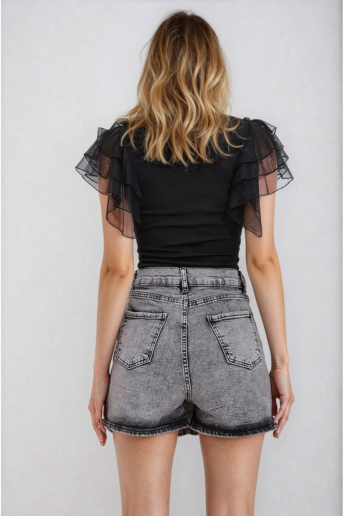 KADIN DÜĞME DETAYLI KOLU TÜLLÜ ESNEK ÖRME KUMAŞ BLUZ