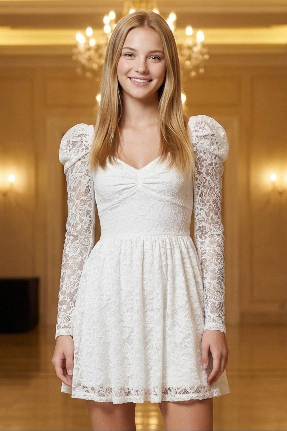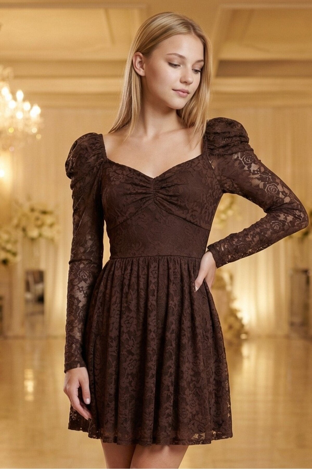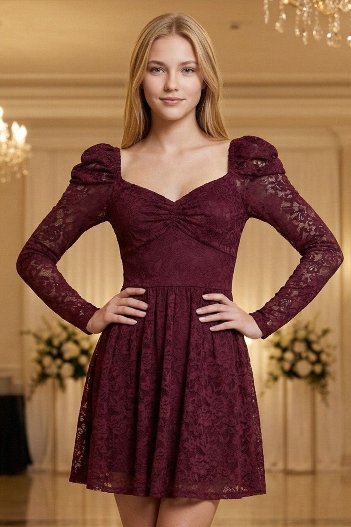 - Zarif dantel kumaşı ile göz alıcı bir görünüm sunar.; - Çiçekli deseniyle feminen ve romantik bir stil yaratır.; - Uzun kollu tasarımı ile şık ve sofistike bir duruş sergiler.; - Kalp yaka detayı ile zarif bir boyun hattı vurgular.; - A kesim silueti, vücut hatlarını nazikçe sararak zarif bir görünüm sağlar.; - Fermuarlı kapama şekli pratik kullanım imkanı sunar.; - Astarlı yapısı sayesinde konforlu bir kullanım deneyimi yaşatır.; - Tüm sezonlar için uygun tasarımı ile yılın her zamanında tercih edilebilir.; - Normal boy uzunluğu, farklı vücut tiplerine uyum sağlar.; - Türkiye\'de üretilmiş olmasıyla yerel üretim desteklenmiş olur.;