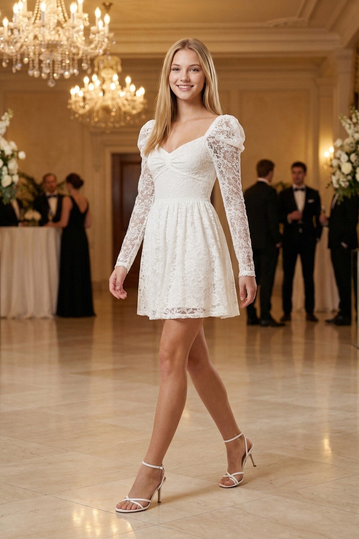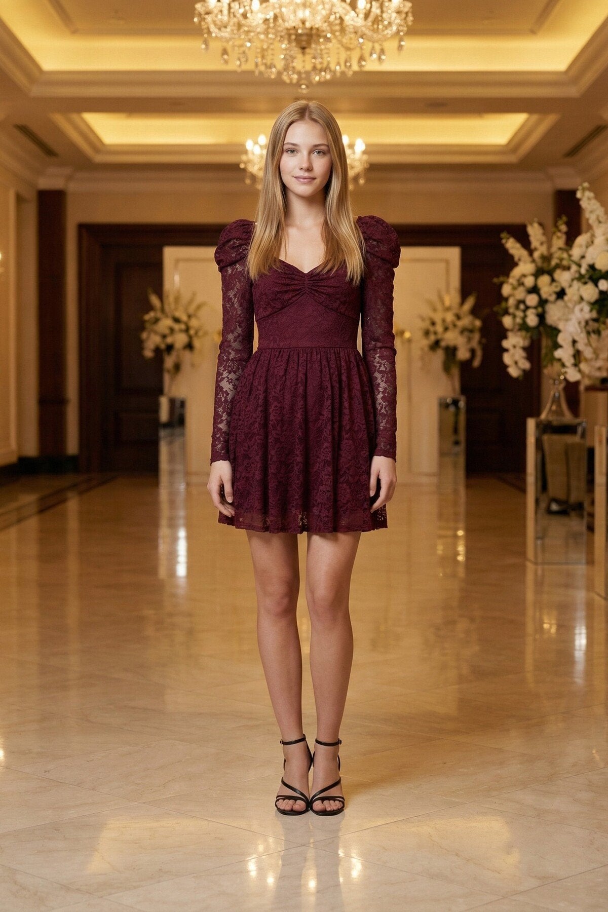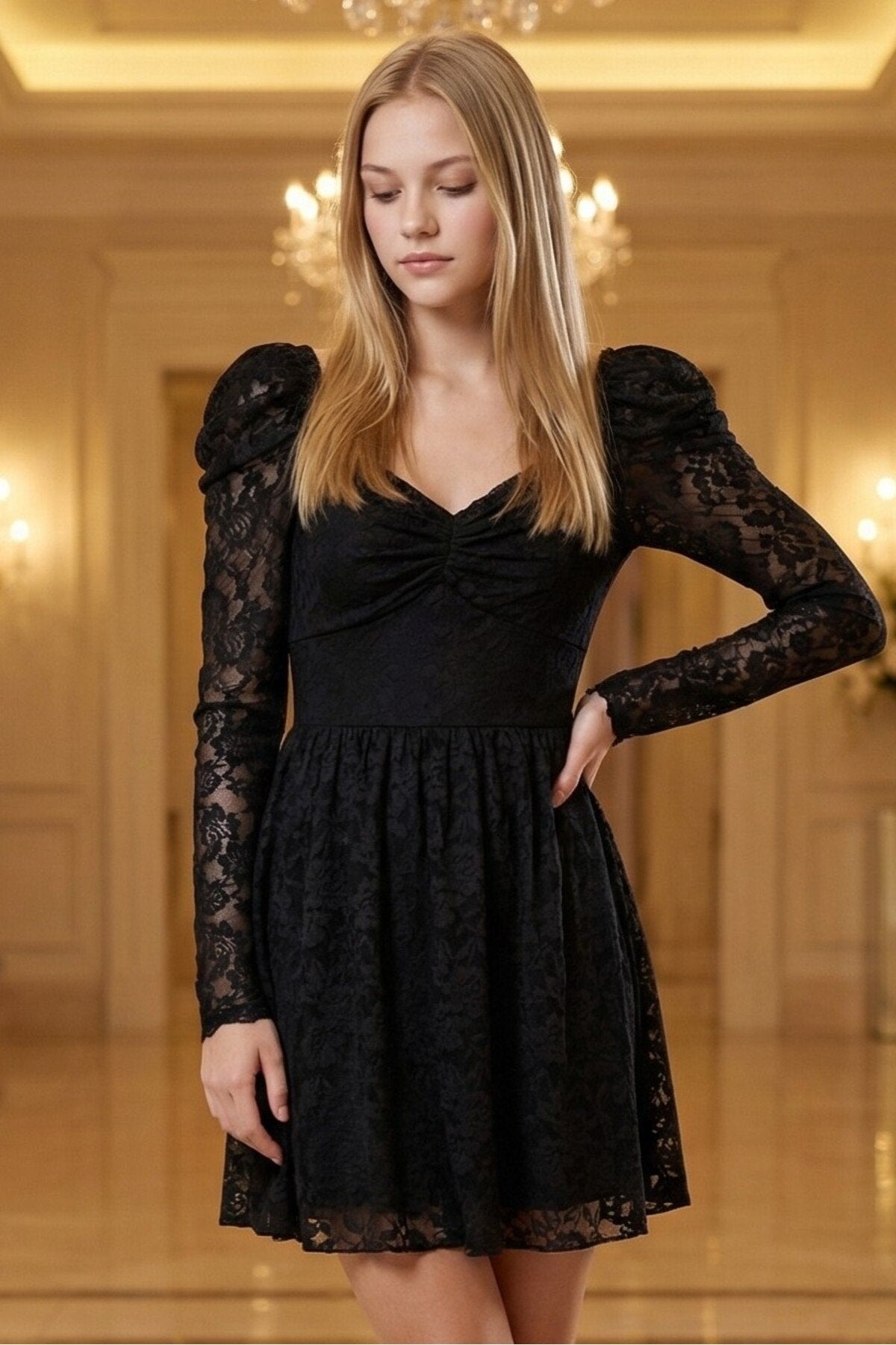- Zarif dantel kumaşı ile göz alıcı bir görünüm sunar.; - Çiçekli deseniyle feminen ve romantik bir stil yaratır.; - Uzun kollu tasarımı ile şık ve sofistike bir duruş sergiler.; - Kalp yaka detayı ile zarif bir boyun hattı vurgular.; - A kesim silueti, vücut hatlarını nazikçe sararak zarif bir görünüm sağlar.; - Fermuarlı kapama şekli pratik kullanım imkanı sunar.; - Astarlı yapısı sayesinde konforlu bir kullanım deneyimi yaşatır.; - Tüm sezonlar için uygun tasarımı ile yılın her zamanında tercih edilebilir.; - Normal boy uzunluğu, farklı vücut tiplerine uyum sağlar.; - Türkiye\'de üretilmiş olmasıyla yerel üretim desteklenmiş olur.;