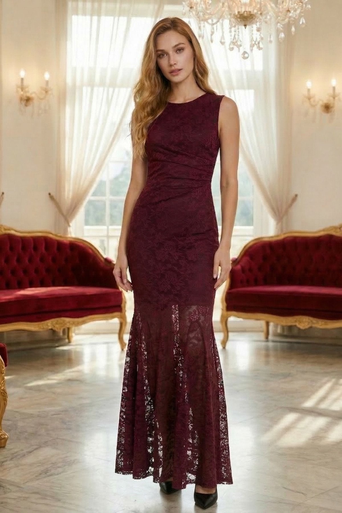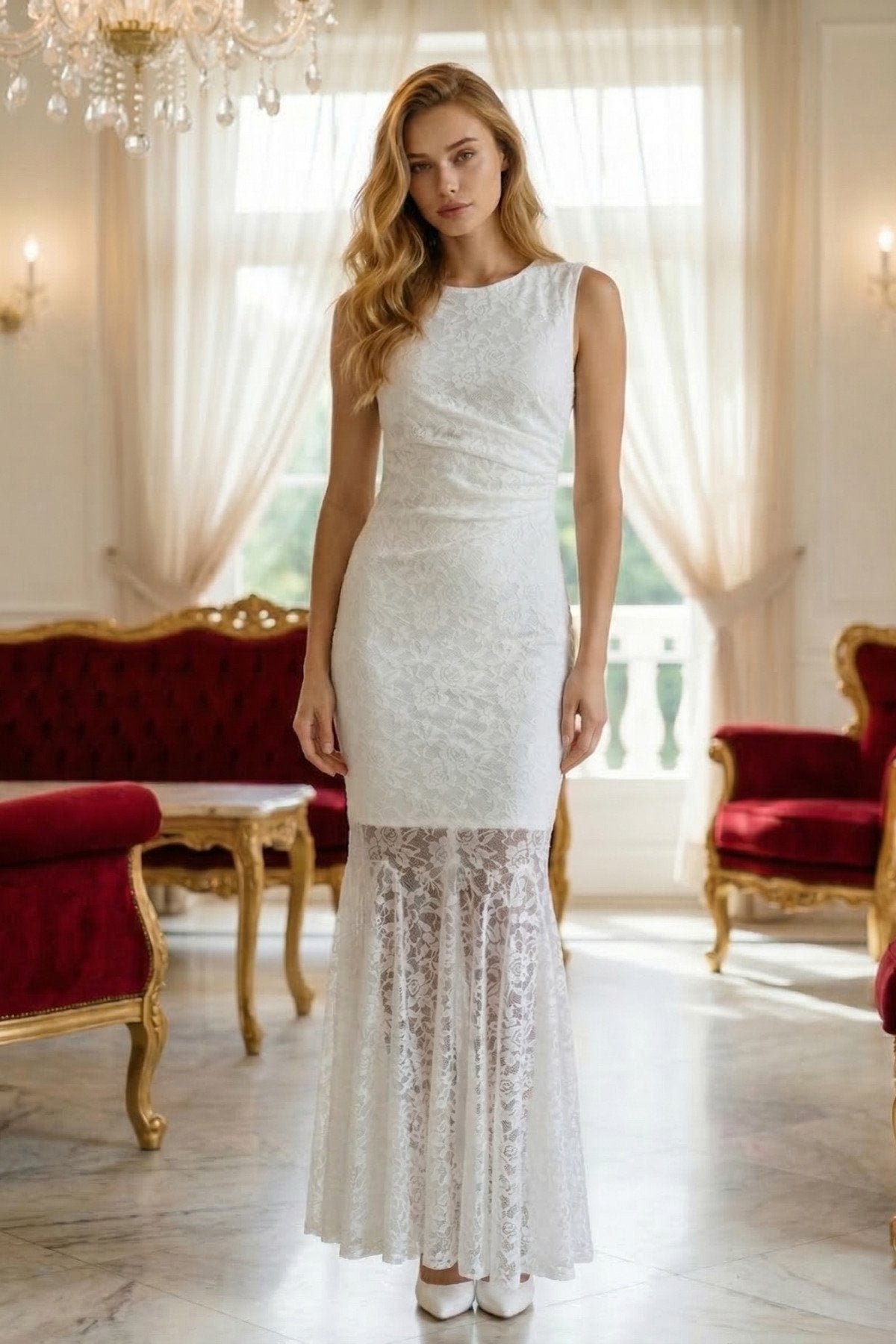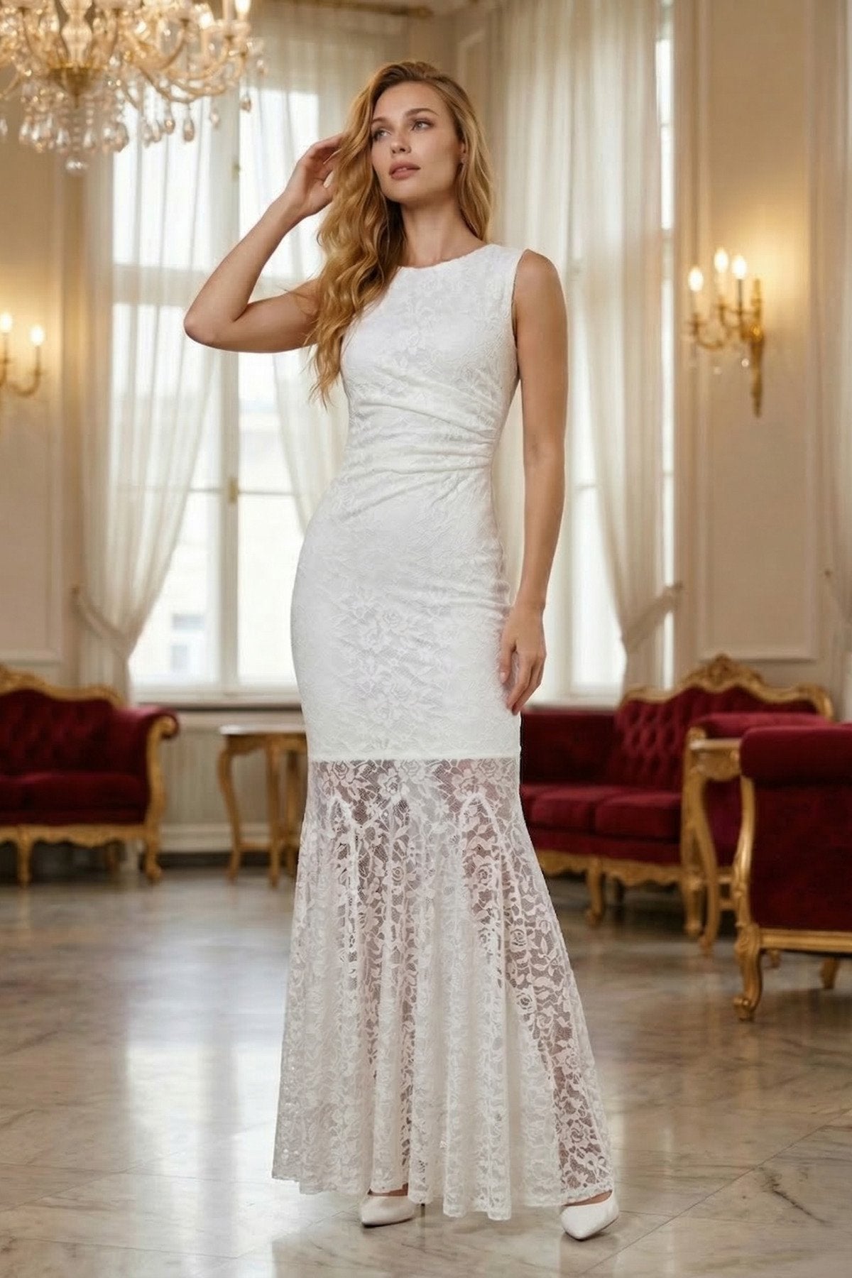KADIN KOLSUZ DRAPE DETAYLI ASTARLI LİKRALI PREMİUM DANTEL KUMAŞ DAVET DÜĞÜN NİŞAN BALO SÖZ ELBİSESİ