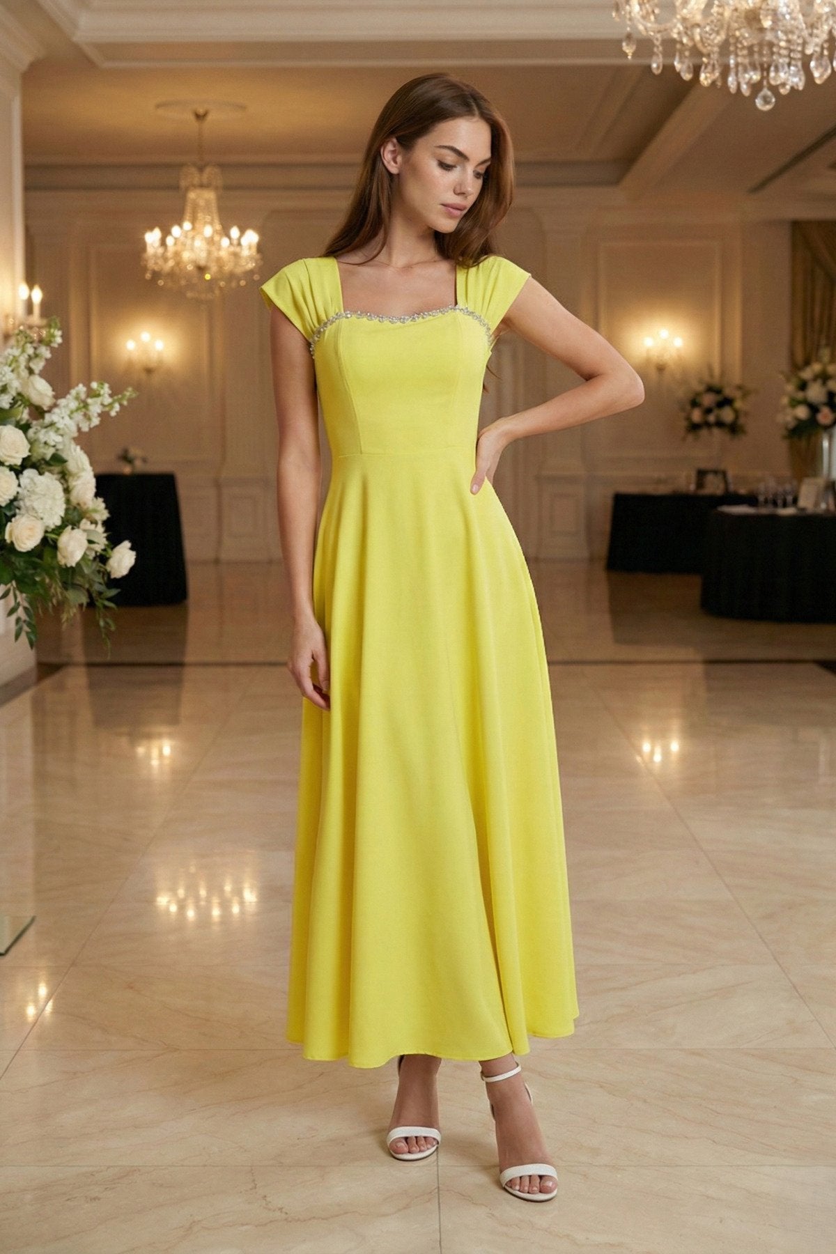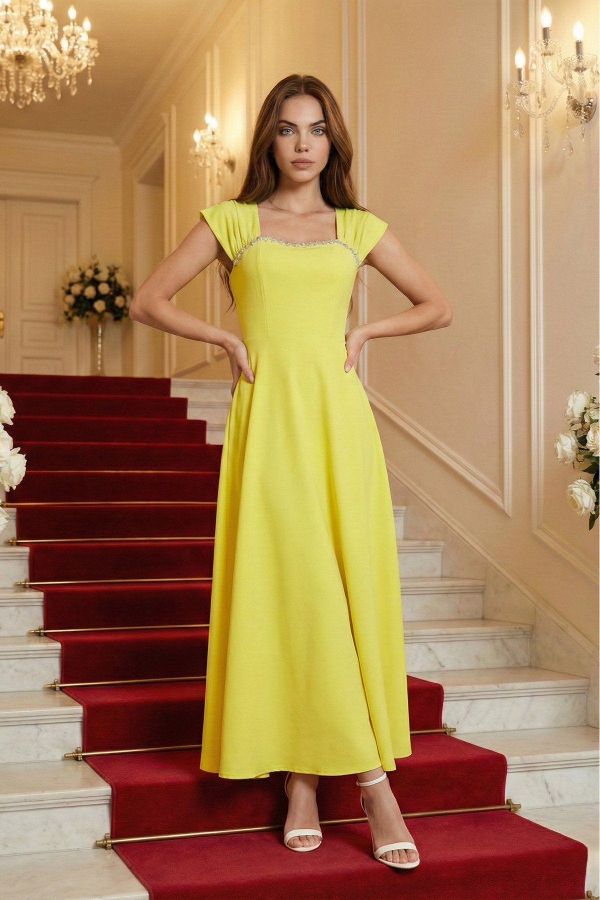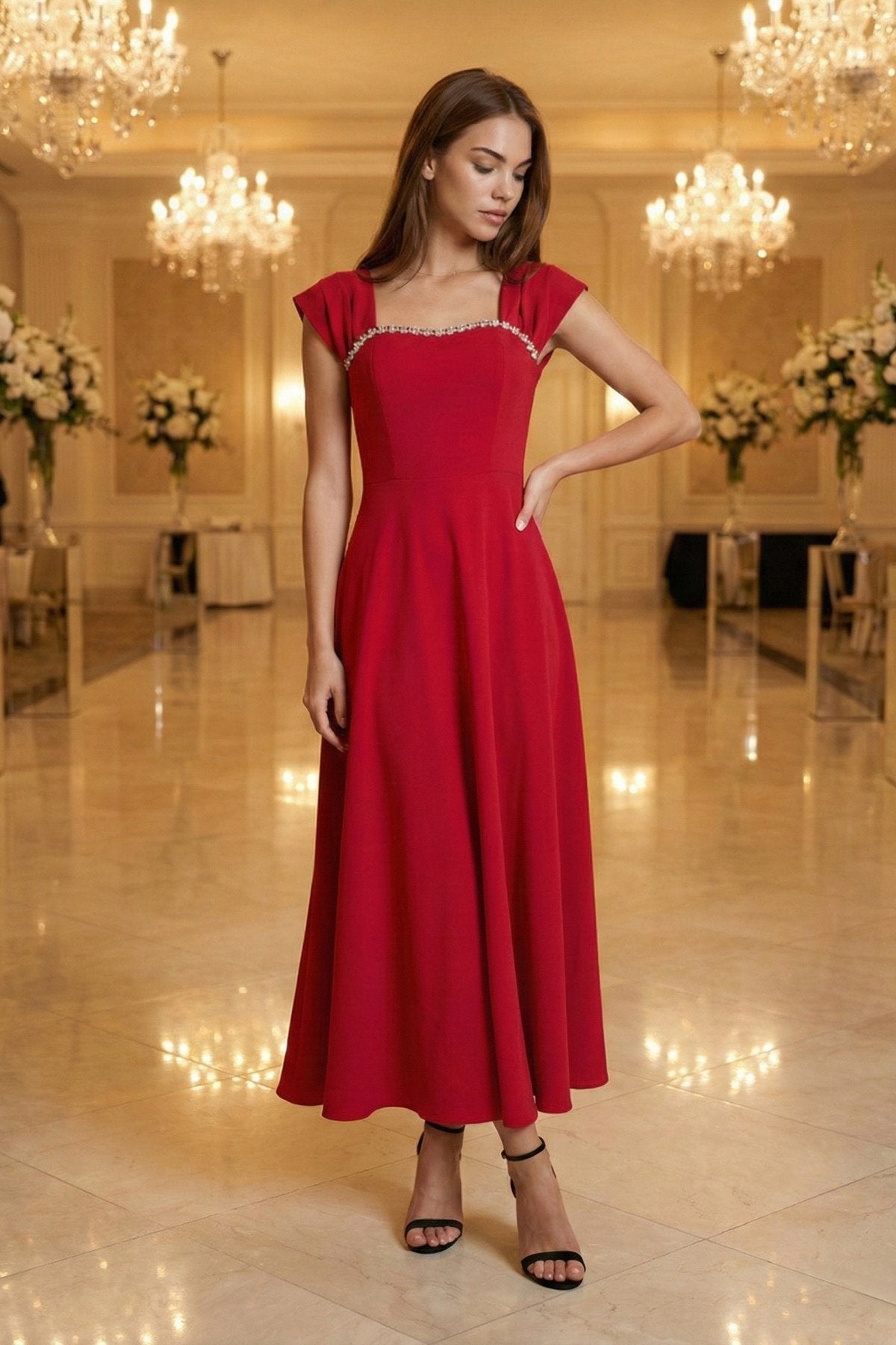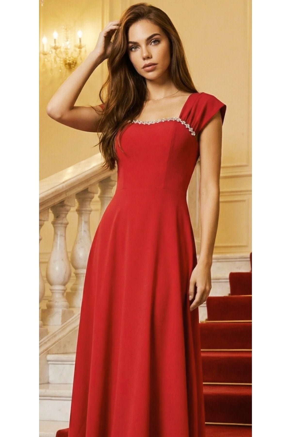 - Zarif kare yaka tasarımı ile dikkat çeken bu elbise, taş aksesuar detaylarıyla göz alıcı bir görünüm sunar.; - Uzun boy kloş kesimi sayesinde feminen silueti vurgulayan bu elbise, düğün, nişan ve davet gibi özel günler için idealdir.; - Düz dokuma polyester kumaşı, konforlu bir kullanım sağlarken şık görünümüyle de öne çıkar.; - A kesim tasarımı ile vücut hatlarını nazikçe sararak zarif bir duruş sergiler.; - Fermuarlı kapama şekli pratik kullanım imkanı sunarken, kemersiz tasarımı modern bir dokunuş katmaktadır.; - Astarsız yapısıyla hafif ve rahat bir deneyim yaşatırken, tüm sezonlarda tercih edilebilecek çok yönlülükte bir elbisedir.; - Mezuniyet ve balo gibi özel etkinliklerde şıklığınızı tamamlayacak bu elbise, düz deseniyle sadelikten yana olanların tercihi olacaktır.;