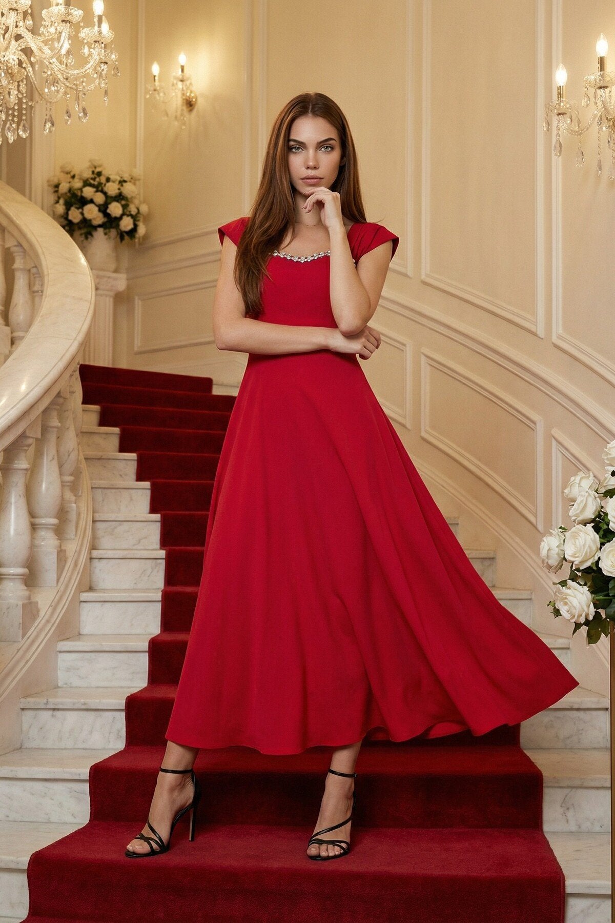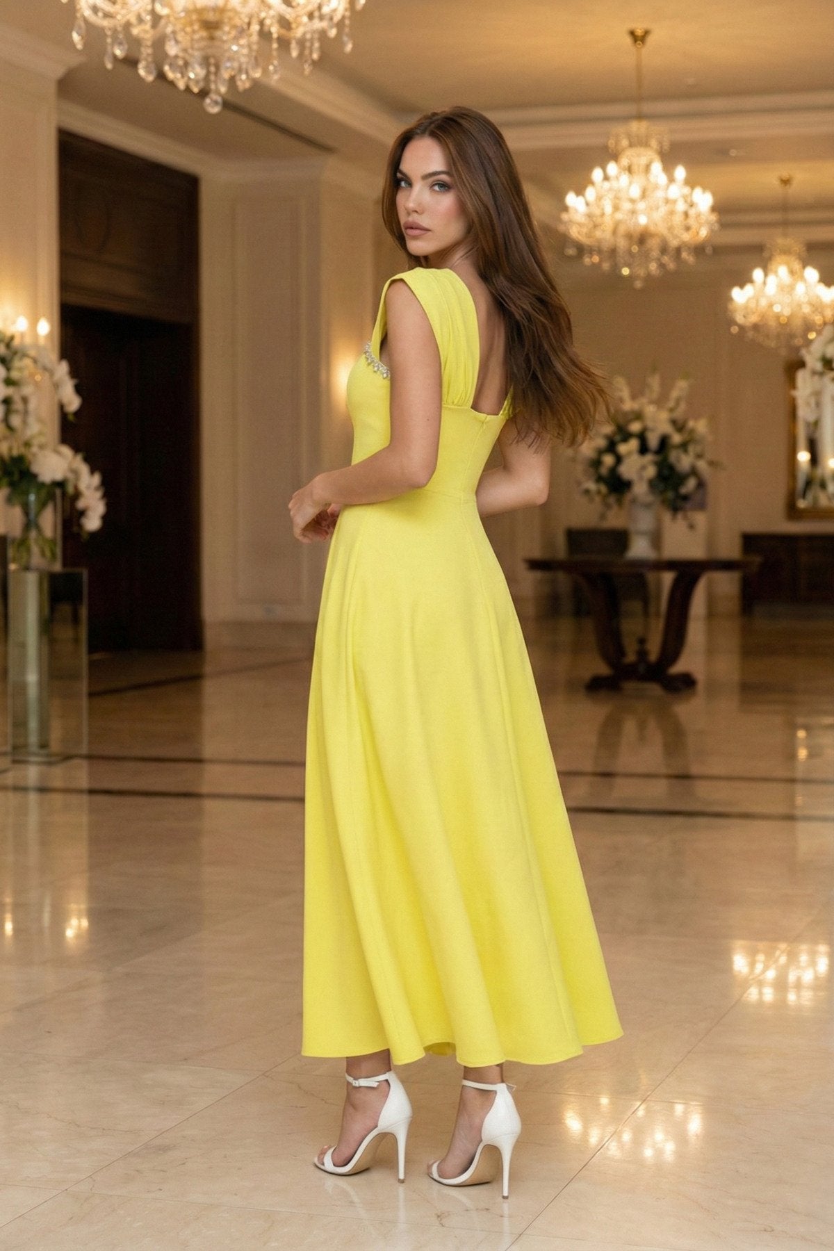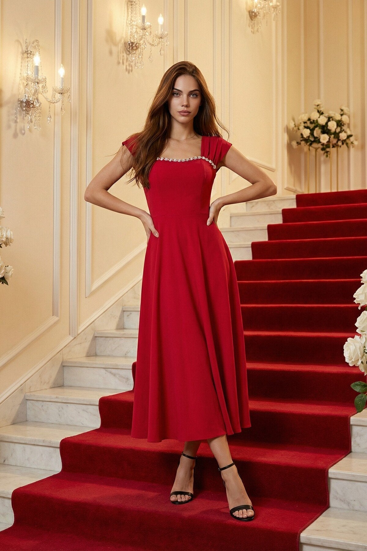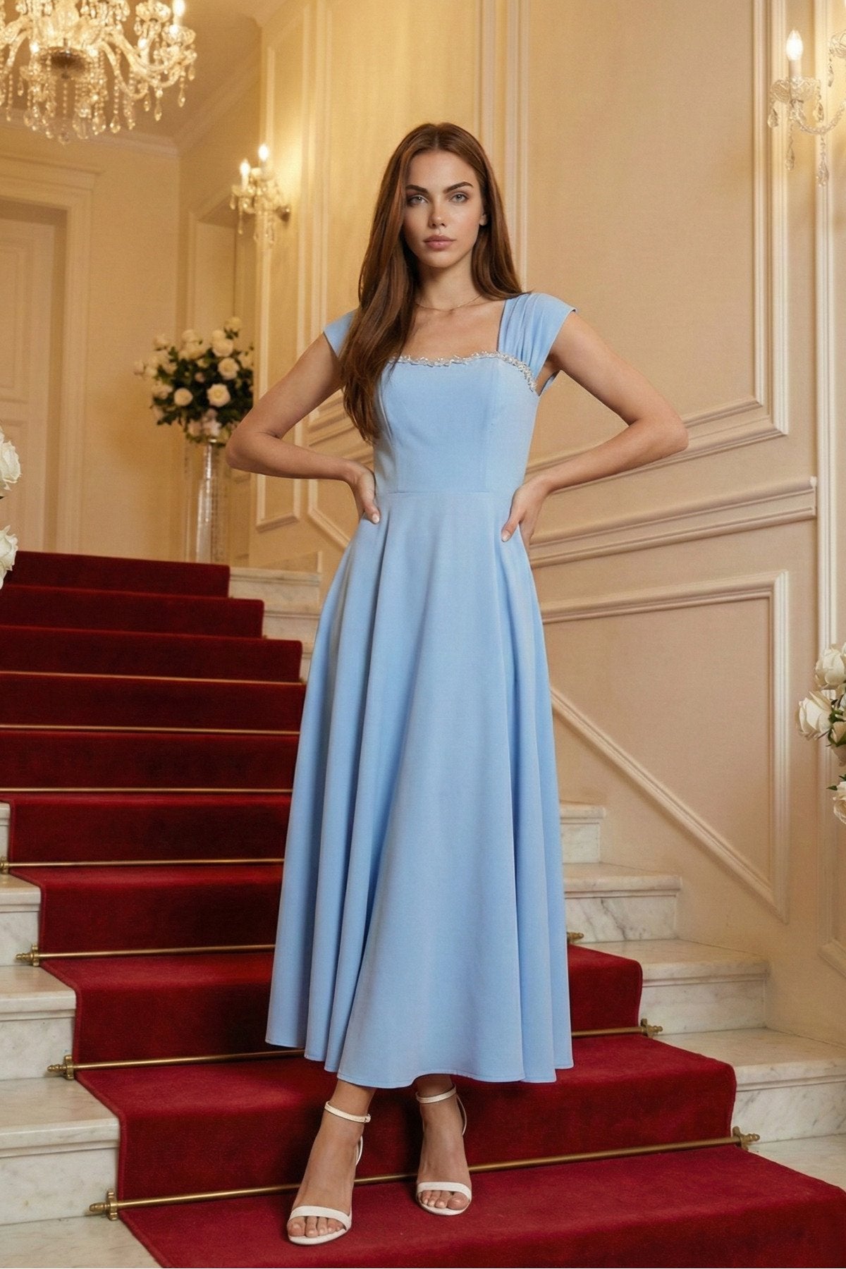 - Zarif kare yaka tasarımı ile dikkat çeken bu elbise, taş aksesuar detaylarıyla göz alıcı bir görünüm sunar.; - Uzun boy kloş kesimi sayesinde feminen silueti vurgulayan bu elbise, düğün, nişan ve davet gibi özel günler için idealdir.; - Düz dokuma polyester kumaşı, konforlu bir kullanım sağlarken şık görünümüyle de öne çıkar.; - A kesim tasarımı ile vücut hatlarını nazikçe sararak zarif bir duruş sergiler.; - Fermuarlı kapama şekli pratik kullanım imkanı sunarken, kemersiz tasarımı modern bir dokunuş katmaktadır.; - Astarsız yapısıyla hafif ve rahat bir deneyim yaşatırken, tüm sezonlarda tercih edilebilecek çok yönlülükte bir elbisedir.; - Mezuniyet ve balo gibi özel etkinliklerde şıklığınızı tamamlayacak bu elbise, düz deseniyle sadelikten yana olanların tercihi olacaktır.;