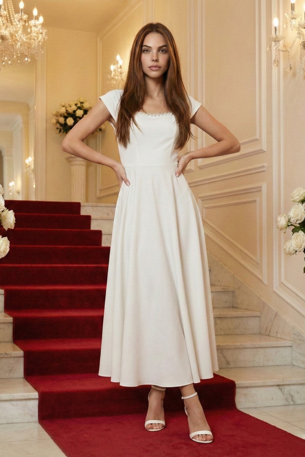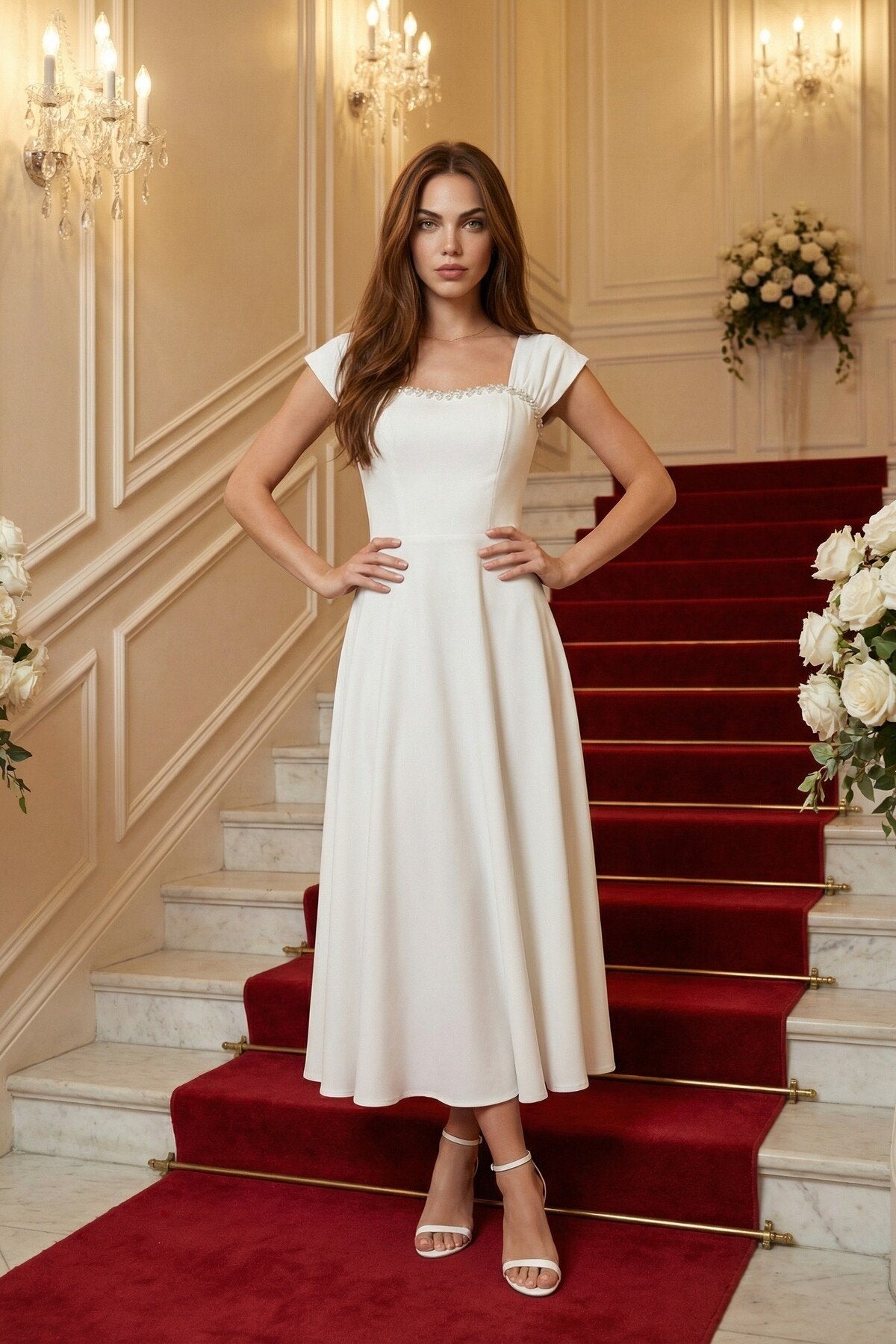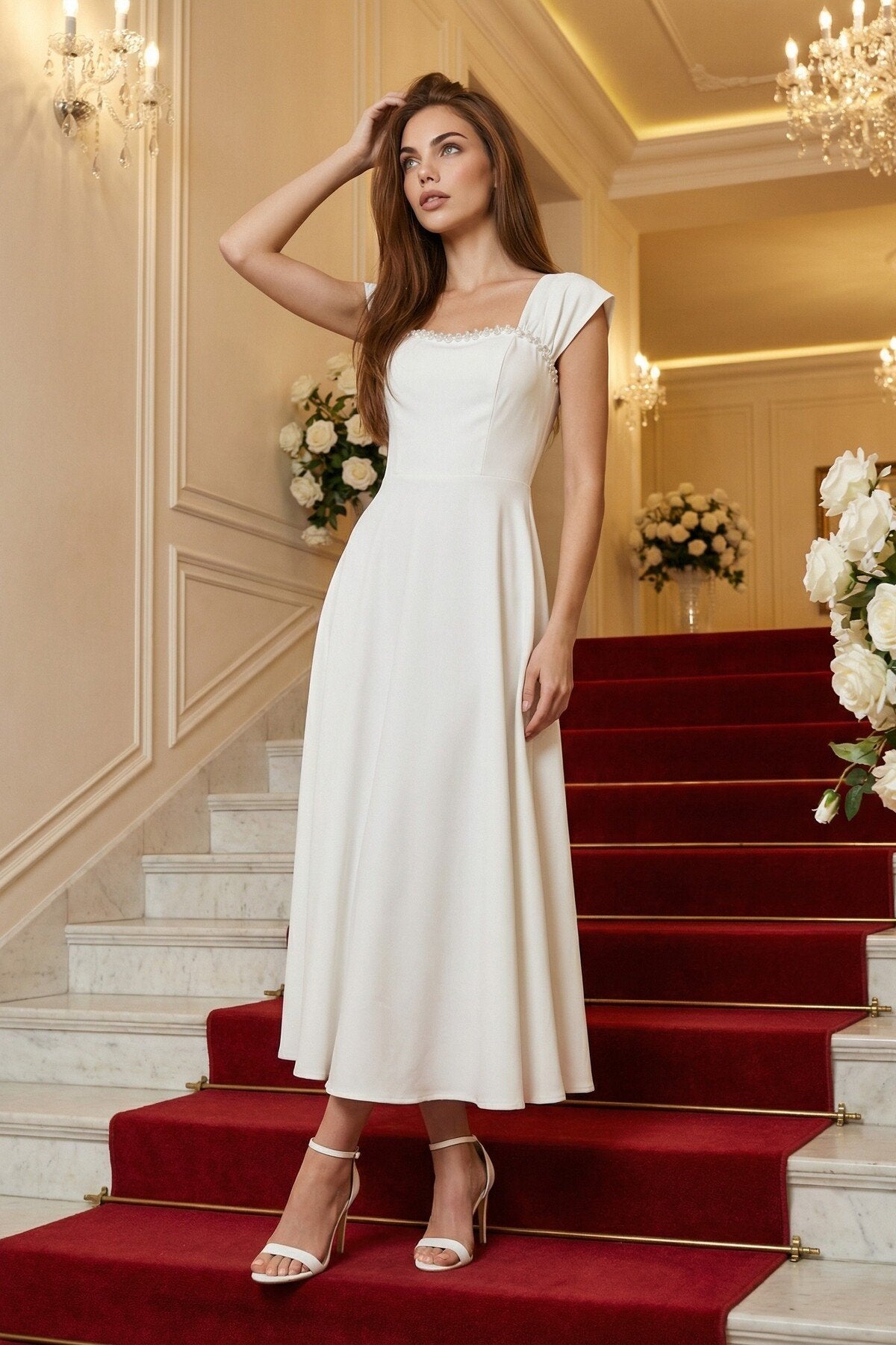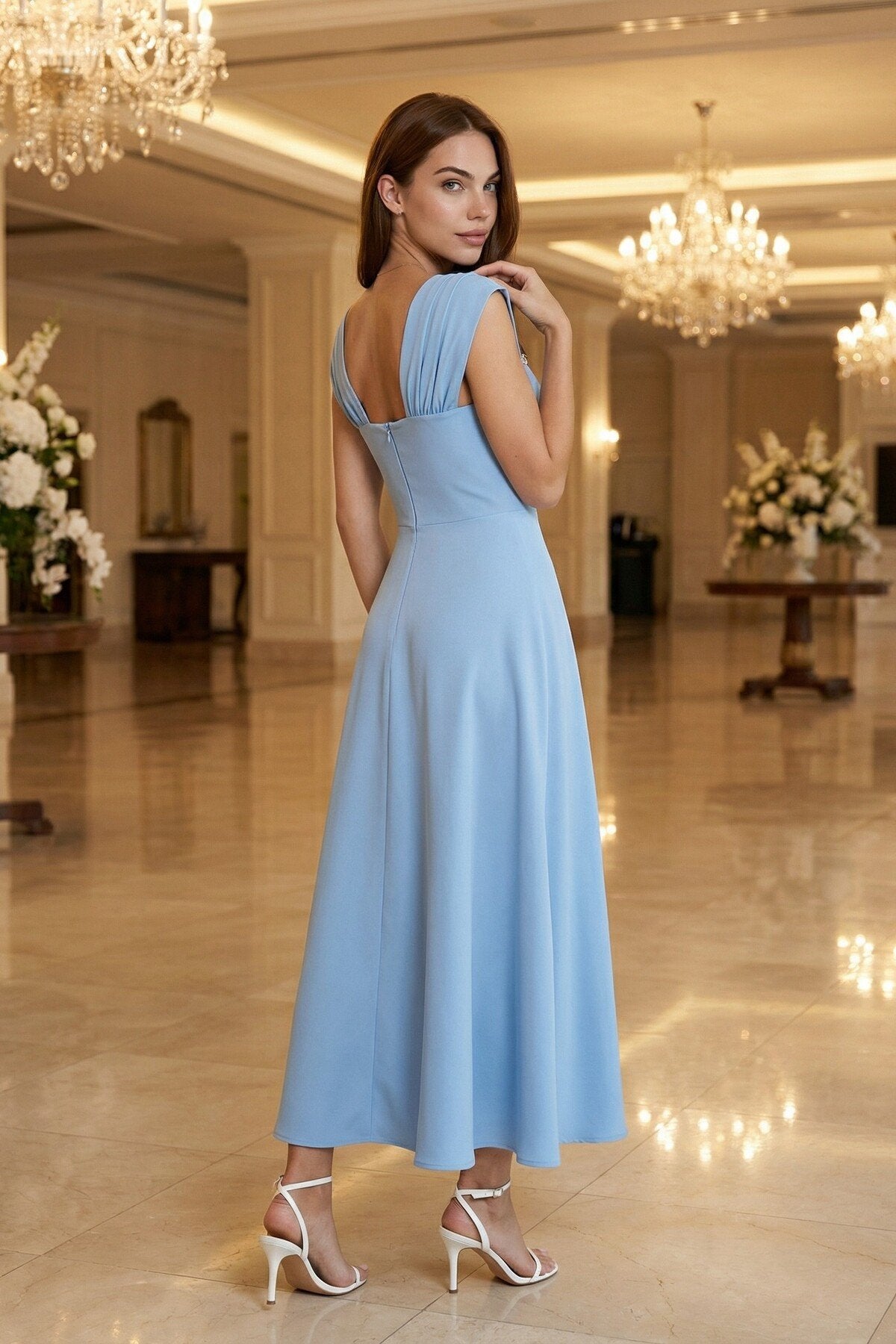 - Zarif kare yaka tasarımı ile dikkat çeken bu elbise, taş aksesuar detaylarıyla göz alıcı bir görünüm sunar.; - Uzun boy kloş kesimi sayesinde feminen silueti vurgulayan bu elbise, düğün, nişan ve davet gibi özel günler için idealdir.; - Düz dokuma polyester kumaşı, konforlu bir kullanım sağlarken şık görünümüyle de öne çıkar.; - A kesim tasarımı ile vücut hatlarını nazikçe sararak zarif bir duruş sergiler.; - Fermuarlı kapama şekli pratik kullanım imkanı sunarken, kemersiz tasarımı modern bir dokunuş katmaktadır.; - Astarsız yapısıyla hafif ve rahat bir deneyim yaşatırken, tüm sezonlarda tercih edilebilecek çok yönlülükte bir elbisedir.; - Mezuniyet ve balo gibi özel etkinliklerde şıklığınızı tamamlayacak bu elbise, düz deseniyle sadelikten yana olanların tercihi olacaktır.;