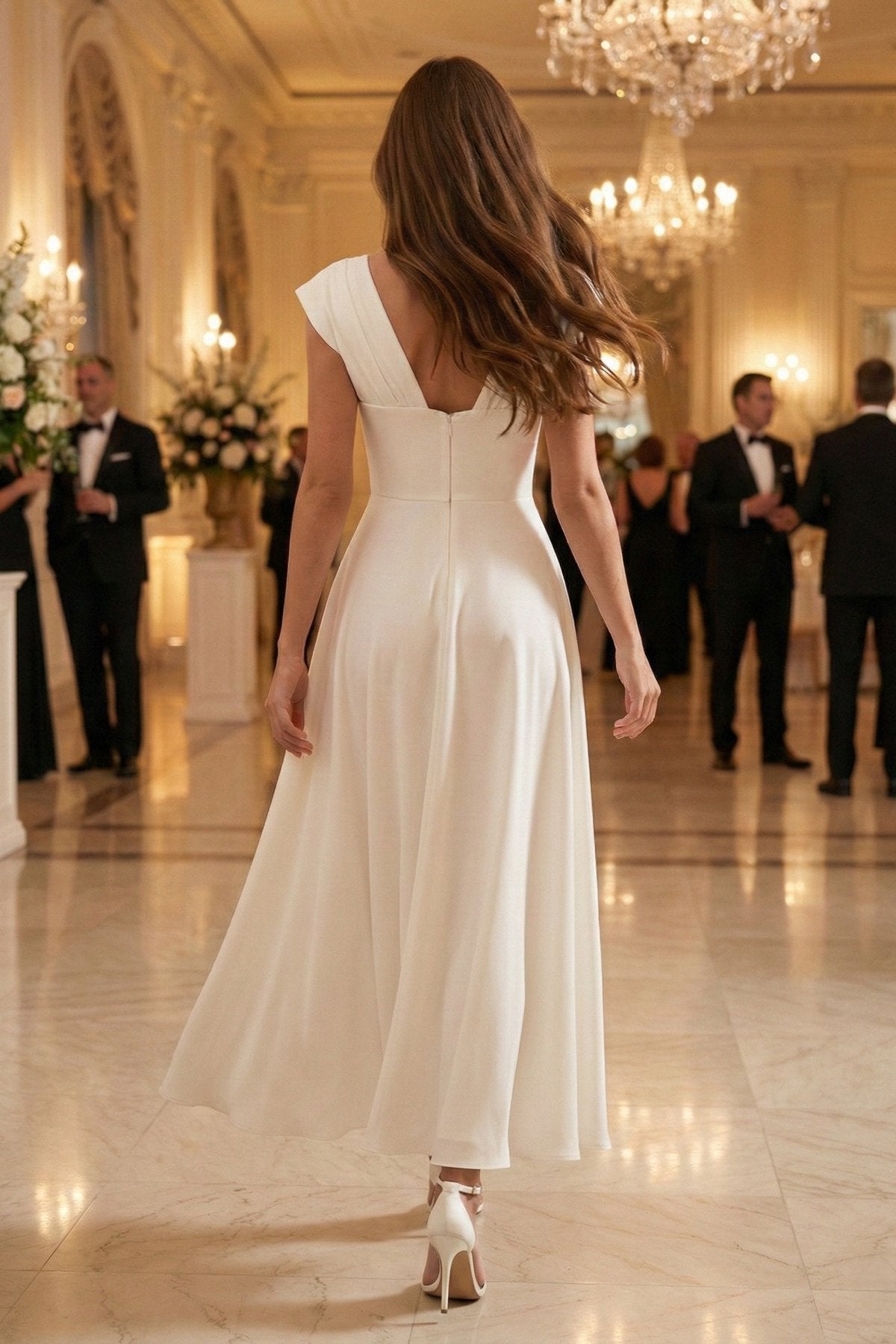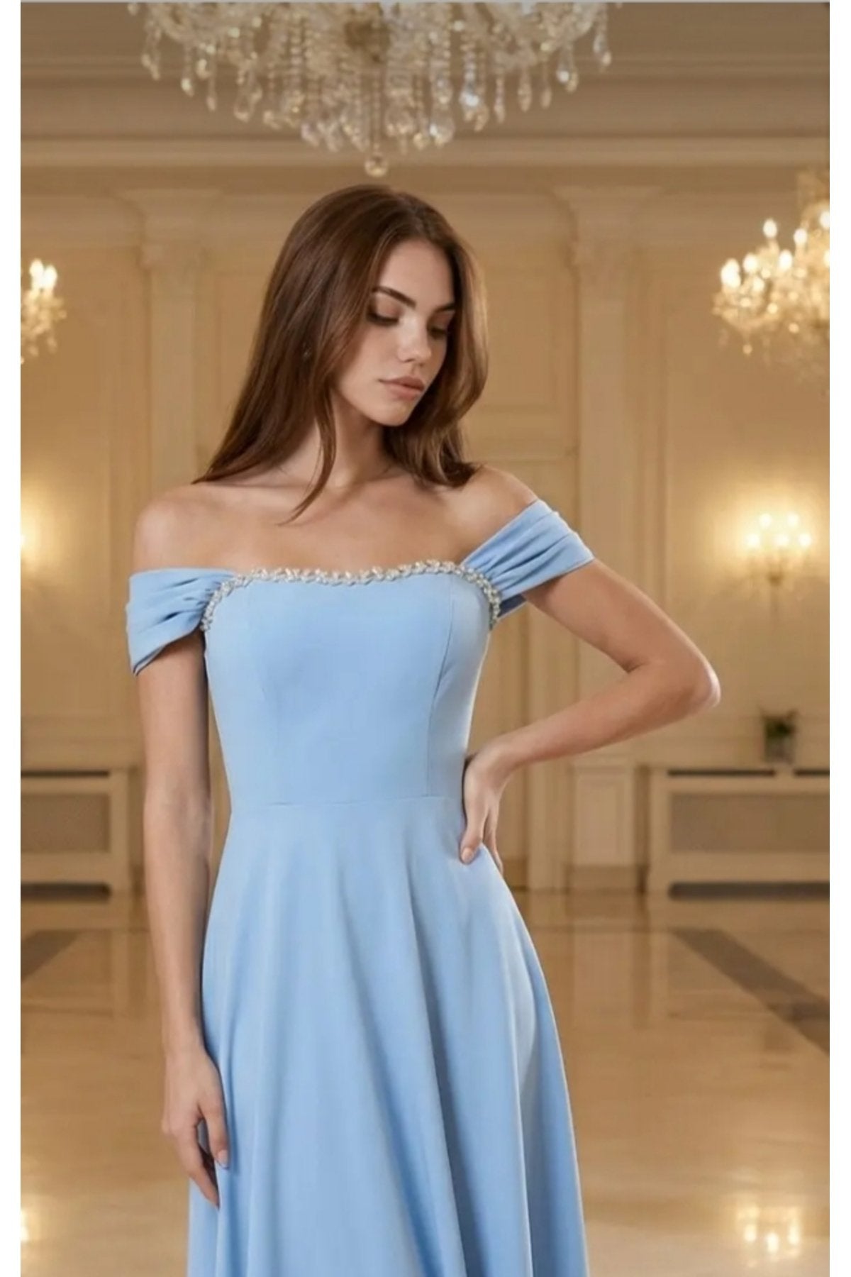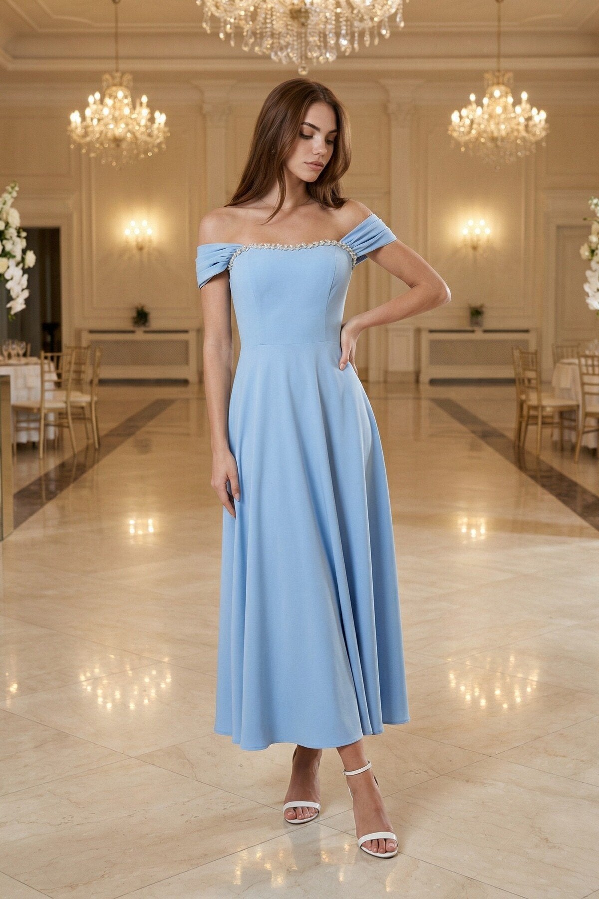 KADIN YAKASI TAŞ AKSESUAR DETAYLI ATLAS KUMAŞ UZUN BOY ETEĞİ KLOŞ ABİYE DÜĞÜN NİŞAN DAVET ELBİSESİ