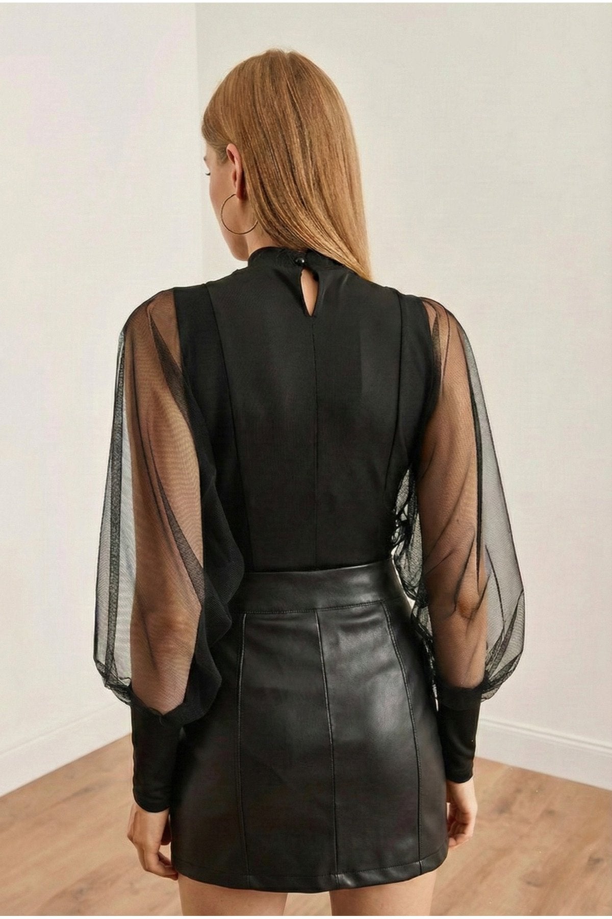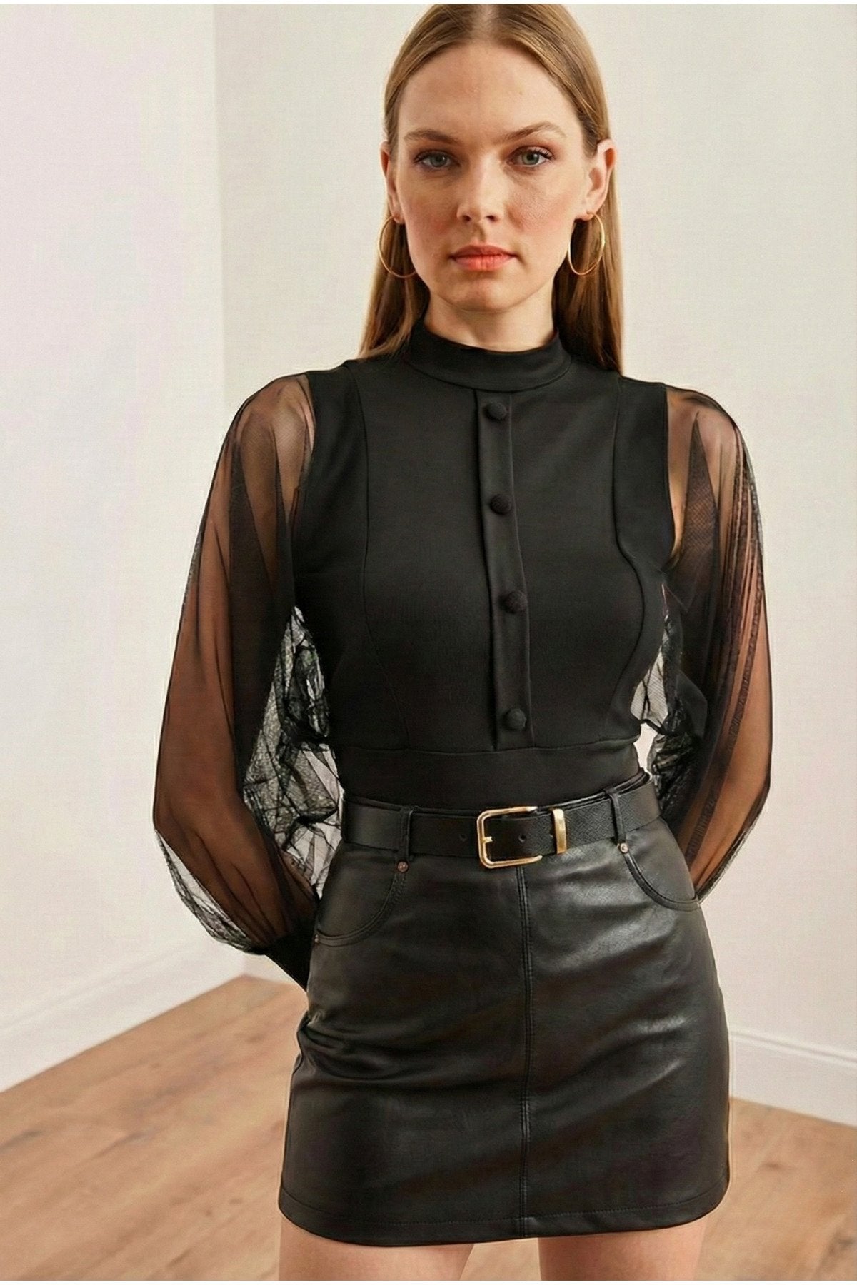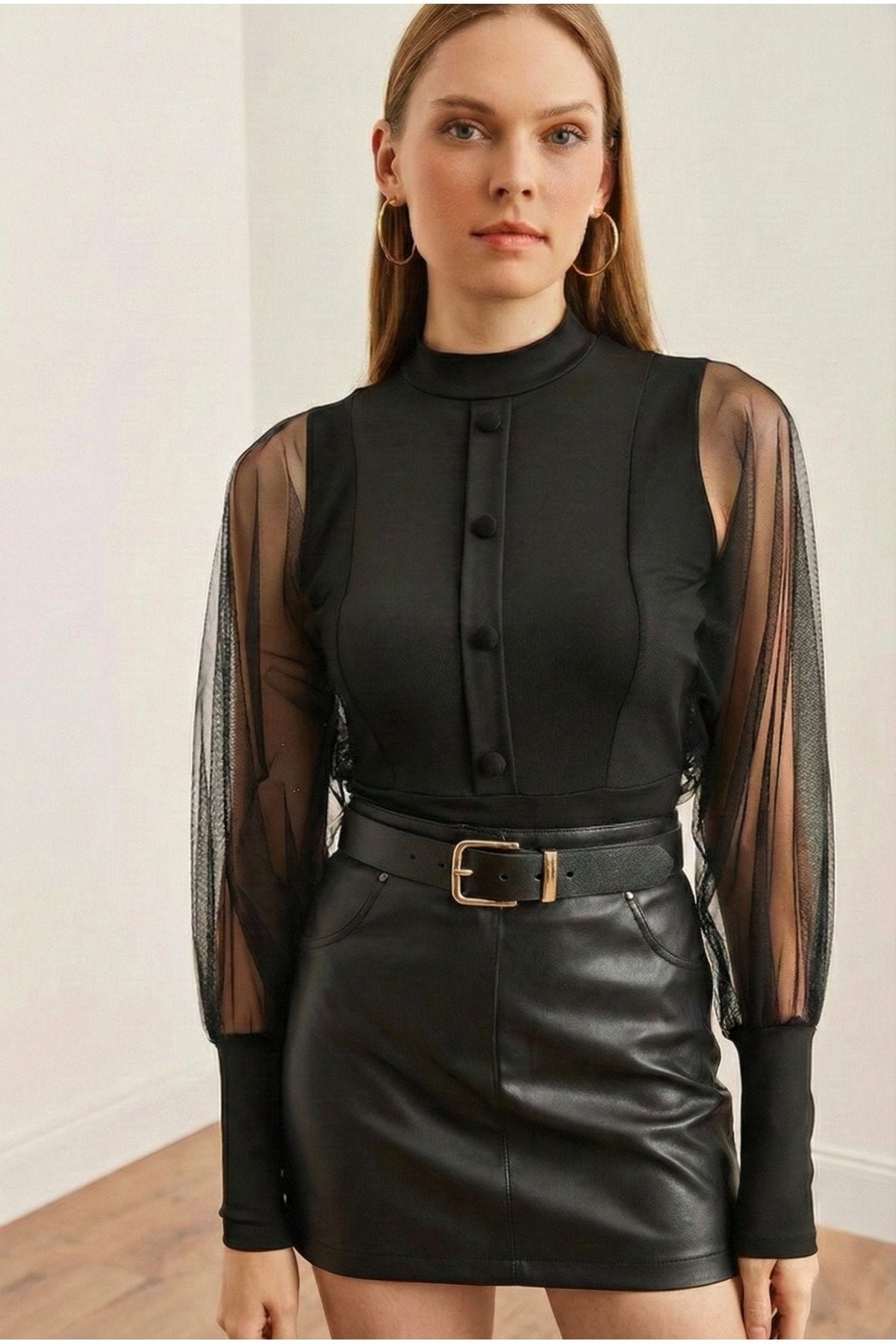 KADIN YARIM BALIKÇI YAKA KOLU TÜL ÖNÜ DÜĞME DETAYLI ESNEK KUMAŞ BLUZ