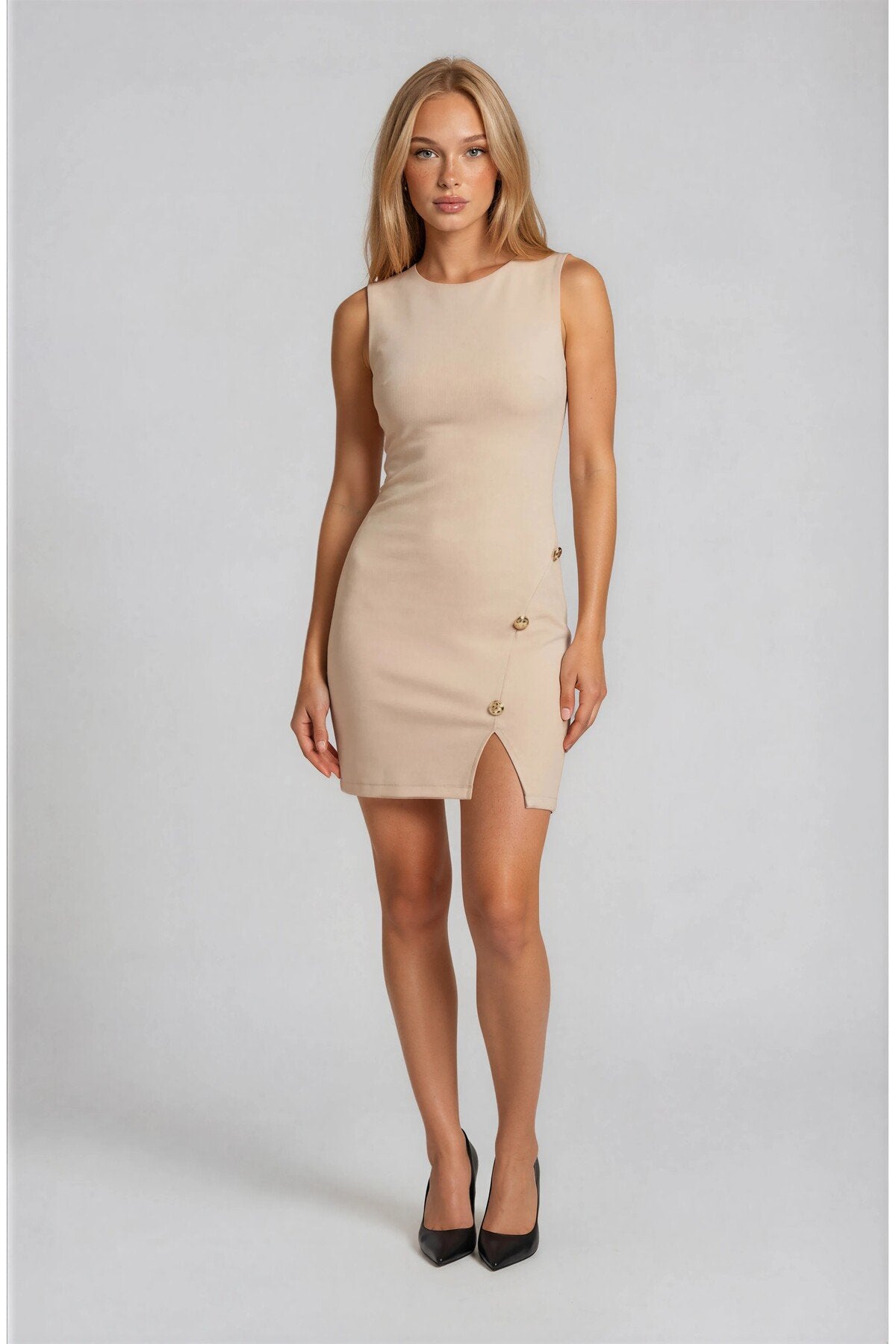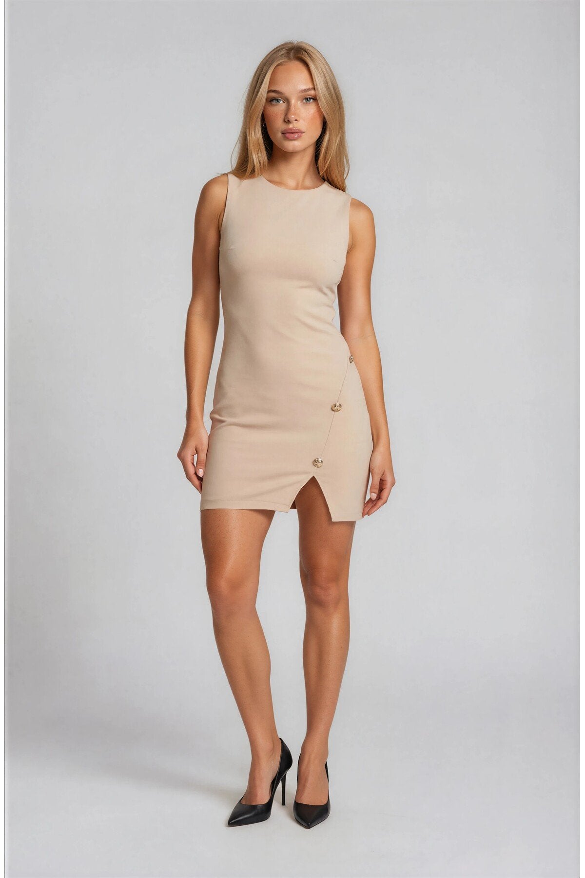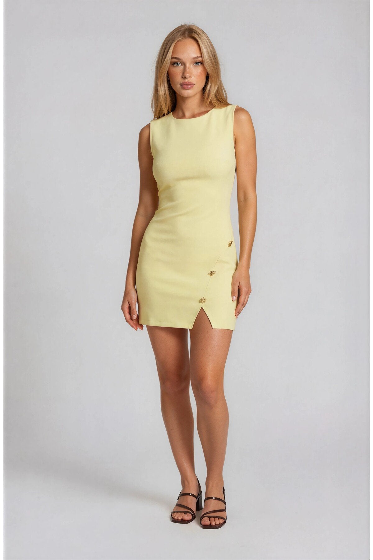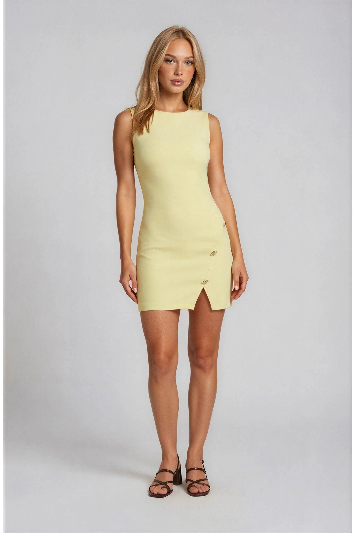 - Zarif tasarımıyla her ortamda şıklığınızı ön plana çıkaracak, kadınların vazgeçilmezi mini elbise.; - Kolsuz tasarımı sayesinde yaz aylarında serinlik ve rahatlık sunar.; - Düz dokuma kumaşı, şık ve sade bir görünüm sağlar.; - Yırtmaç detayı ile feminen siluetinizi vurgular ve hareket özgürlüğü tanır.; - Düğme detayları ile klasik ve modern çizgileri bir arada sunar.; - Yuvarlak yaka tasarımı, boynunuzu zarifçe çerçeveler.; - Kalem kalıbı sayesinde vücut hatlarınıza mükemmel uyum sağlar.; - Fermuarlı kapama şekli pratik kullanım imkanı sunar.; - Tek parça olarak sunulan bu elbise, gardırobunuzun temel parçalarından biri olacak.; - Tüm sezonlar için uygun olan bu elbise ile her mevsim şıklığınızdan ödün vermezsiniz.;