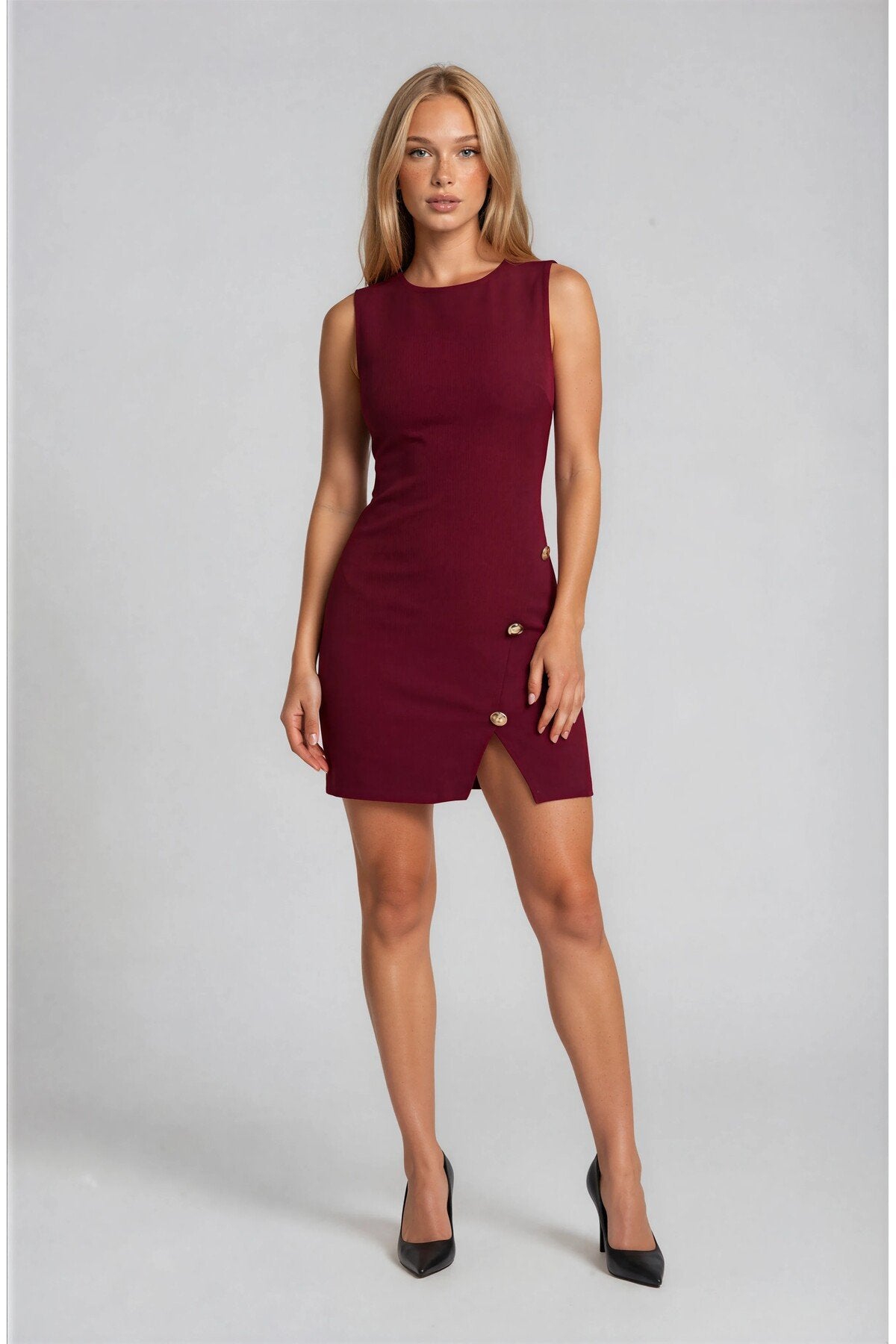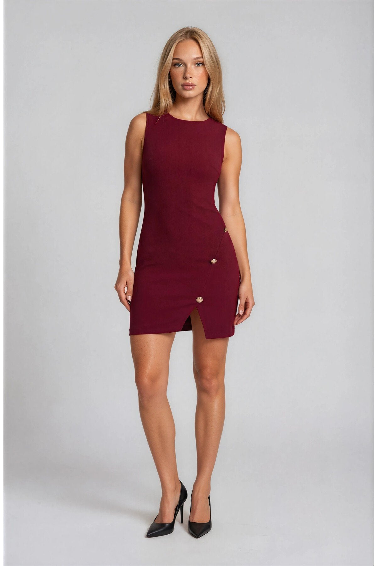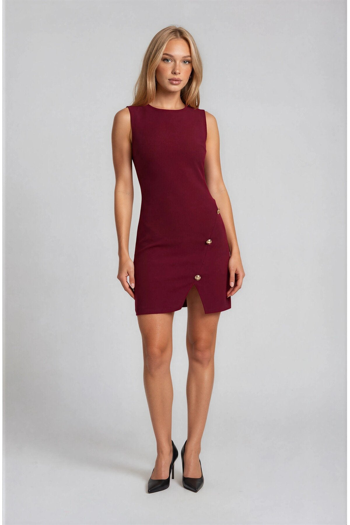 - Zarif tasarımıyla her ortamda şıklığınızı ön plana çıkaracak, kadınların vazgeçilmezi mini elbise.; - Kolsuz tasarımı sayesinde yaz aylarında serinlik ve rahatlık sunar.; - Düz dokuma kumaşı, şık ve sade bir görünüm sağlar.; - Yırtmaç detayı ile feminen siluetinizi vurgular ve hareket özgürlüğü tanır.; - Düğme detayları ile klasik ve modern çizgileri bir arada sunar.; - Yuvarlak yaka tasarımı, boynunuzu zarifçe çerçeveler.; - Kalem kalıbı sayesinde vücut hatlarınıza mükemmel uyum sağlar.; - Fermuarlı kapama şekli pratik kullanım imkanı sunar.; - Tek parça olarak sunulan bu elbise, gardırobunuzun temel parçalarından biri olacak.; - Tüm sezonlar için uygun olan bu elbise ile her mevsim şıklığınızdan ödün vermezsiniz.;